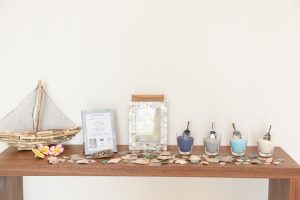 挙式で新郎新婦がそこに最後の砂を入れて完成させるという、