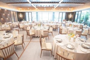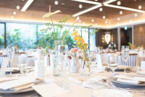 お花とテーブルクロスが会場全体のカラーバランスを作ります。