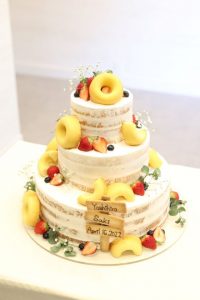 一般的なウエディングケーキと違い、全面にクリームを塗らないのが特徴。