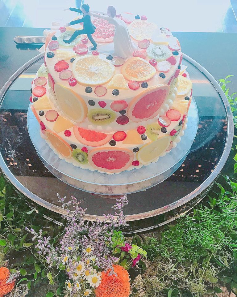 色鮮やかなウェディングケーキ☆ たくさんのフルーツを使用して♡ お二人もお二人だけのオリジナルウェディ...