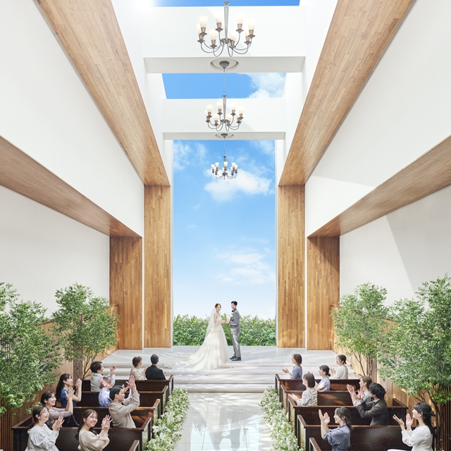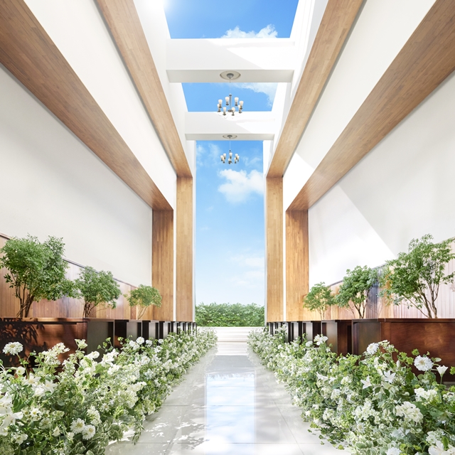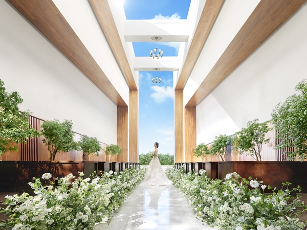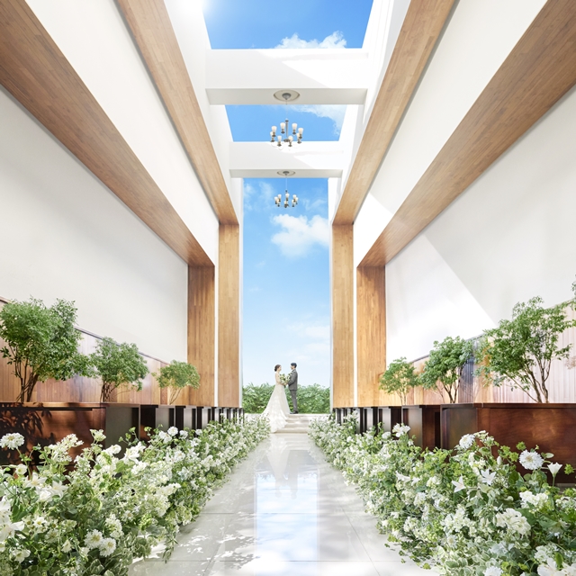 祭壇へと続く天窓には抜けるような青空が広がり、9mの高さの天井から降り注ぐまばゆい光が、チャペル全体を優しく包み込みます。空の青が純白のバージンロードに映し出され、まるで空の上を歩いているような感覚に。祝福の光に満ちた美しい空間で、 神聖なセレモニーを叶えていただけます。