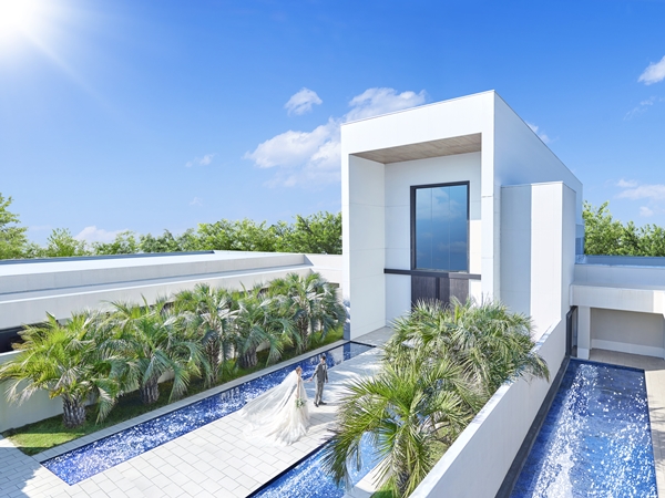 シックな大階段を抜けると一気に視界が開け、光と水が幻想的な世界をつくるチャペルガーデンへ。遮るものが何もない一面の青い空の下では、バルーンリリースやフラワーシャワーなどの絵になる演出をお愉しみいただけます。リゾートならではの心地よさを堪能しながら、笑顔あふれる時間をお過ごしください。
