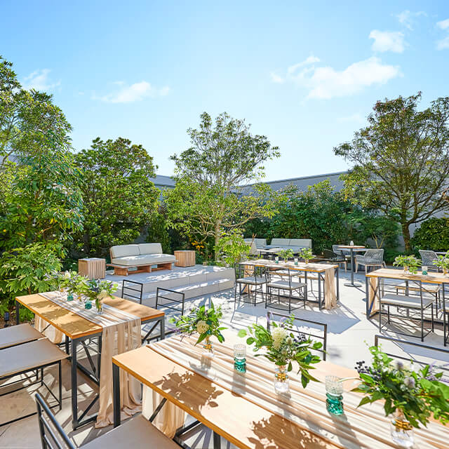 青空と自然が感じられる非日常の空間、楽園リゾートのような上質な心地よさが魅力のヒルズスィーツ宇都宮ブリーズテラス。パーティー会場やガーデンなどの敷地すべてを自由に使えるため、多彩なパーティーやプログラムに対応できます。また、受付としてご利用いただけるラウンジや控え室など、快適にお過ごしいただける空間と設備をご用意しております。