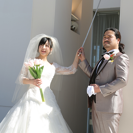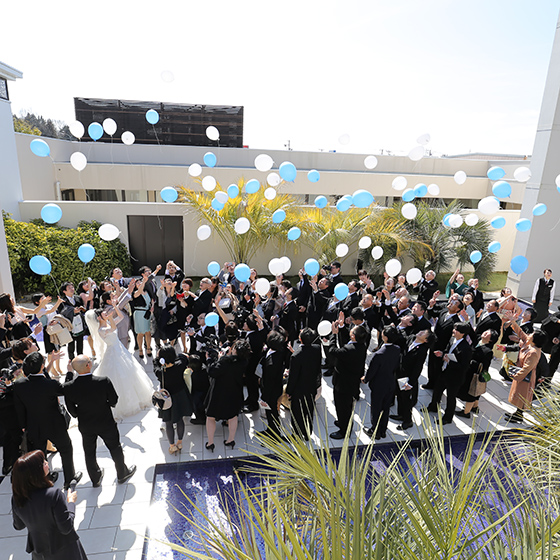 「人前式にすると決めていました。プランナーさんからの提案で、誓いの言葉は自分たちで考えました。お互いの母に誓いの言葉を投げかけてもらい、アットホームだけど夫婦になった喜びと責任を感じることのできる式になりました。全員が参加できる演出がしたくてバルーンリリースにしました。願いを込めたバルーンが青空にたくさん飛んでとてもキレイでした。」