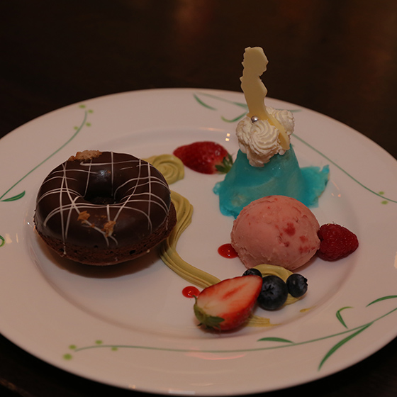 「夢と魔法に溢れた非日常を味わえるように会場の雰囲気にこだわりました。装花のスタッフさんとシェフさんに隠れキャラをたくさん用意して頂きました。当日、予想以上の隠れキャラたちに私たちまで大興奮(笑)。大人のゲストもお子様ゲストも楽しそうで嬉しかったです。パティシエさんには特にわがままを聞いてもらい、お城をモチーフのオリジナルデザートを作ってもらいました。ゲストも必ず写真を撮っていて可愛くて美味しくて、大満足です。リボンワンズを魔法の杖に見立てて、各卓に用意し、テーブルに魔法をかけてもらいました。」