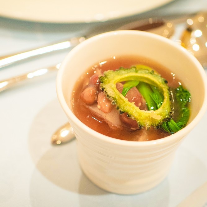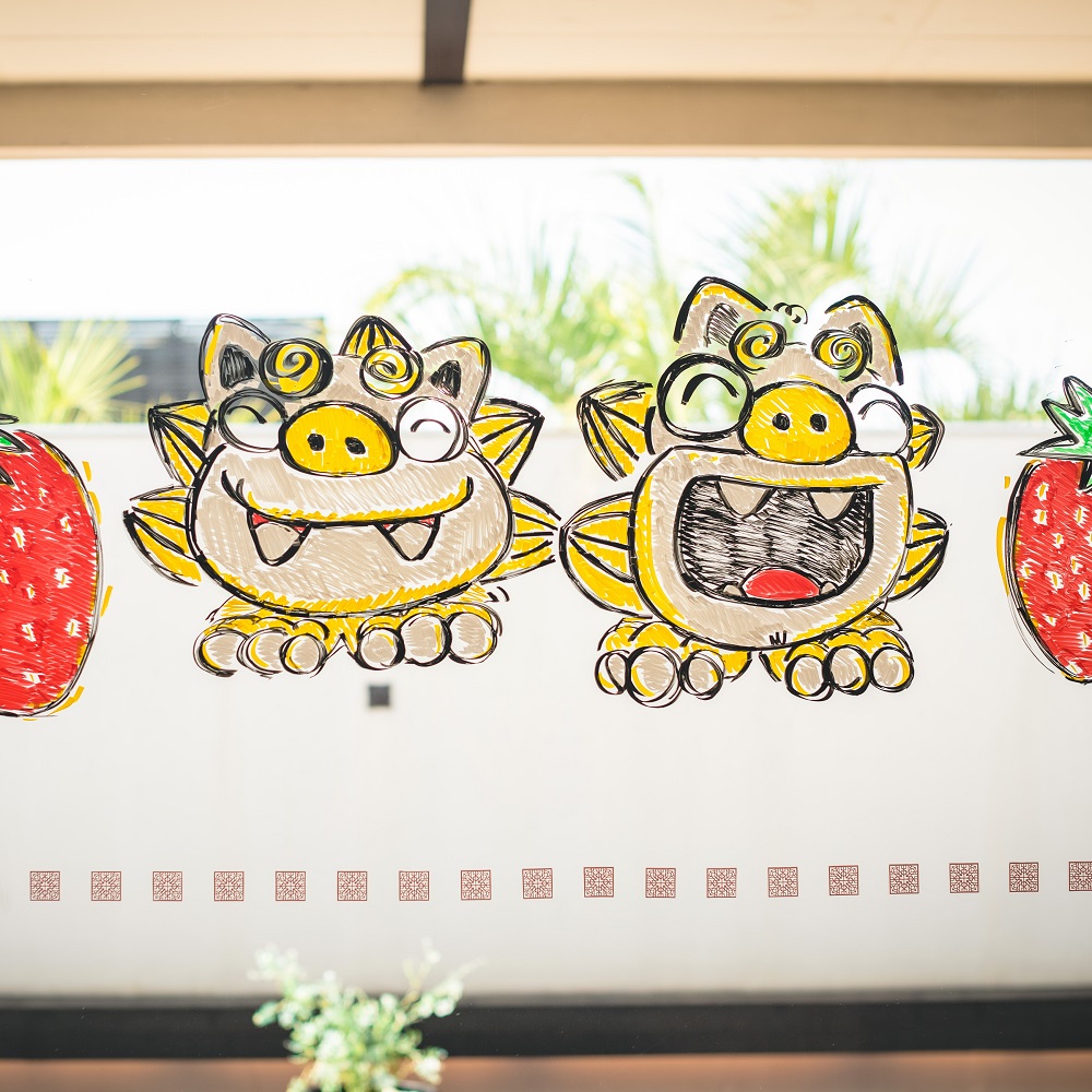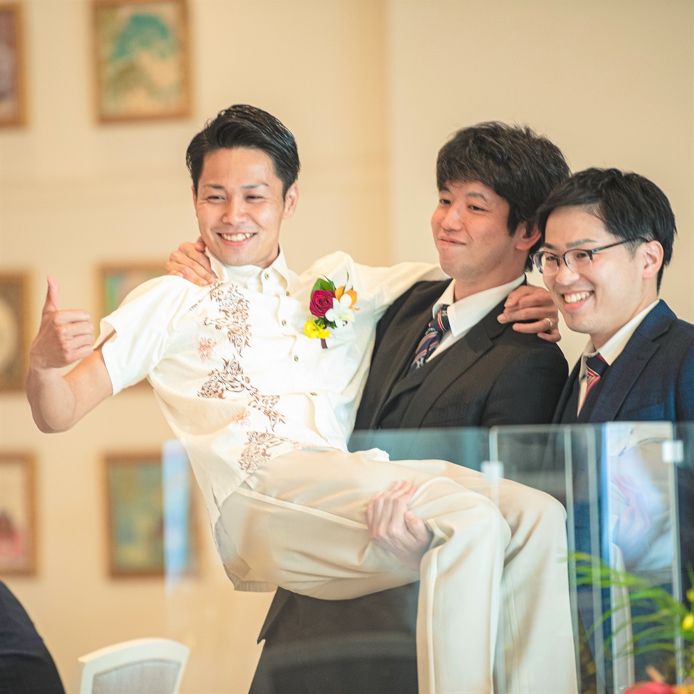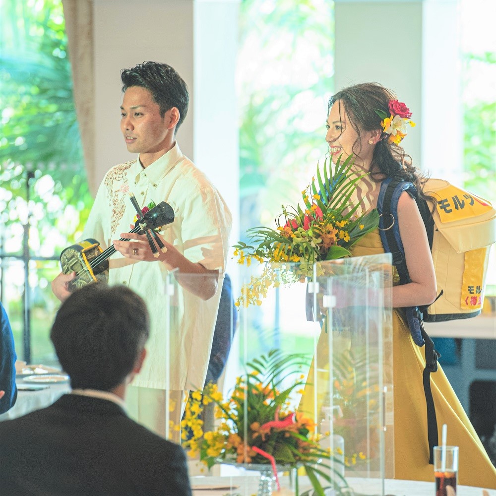 式のテーマである「沖縄」を前面に出し、栃木で沖縄を感じてもらおうと打ち合わせを進めてきました。沖縄から来る親戚にも協力してもらい、新郎新婦入場後に沖縄の結婚式では定番の「かぎやで風」(沖縄ではめでたい席で披露される踊り)から始まり、BGMも沖縄出身アーティスト、料理やデザートビュッフェでも沖縄の食べ物を取り入れ、沖縄気分を全身で感じていただけるようにしました。披露宴の最後には新郎新婦・ゲスト・キャストの皆さん全員で「カチャーシー」(幸せをかき混ぜる意味の踊り)をすることで皆さんとひとつになって楽しむことができ、最高の披露宴の結びになりました。