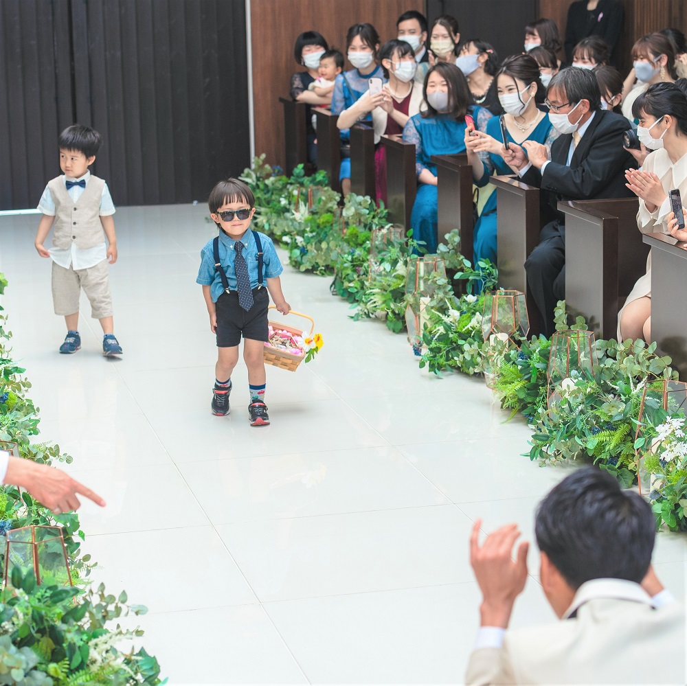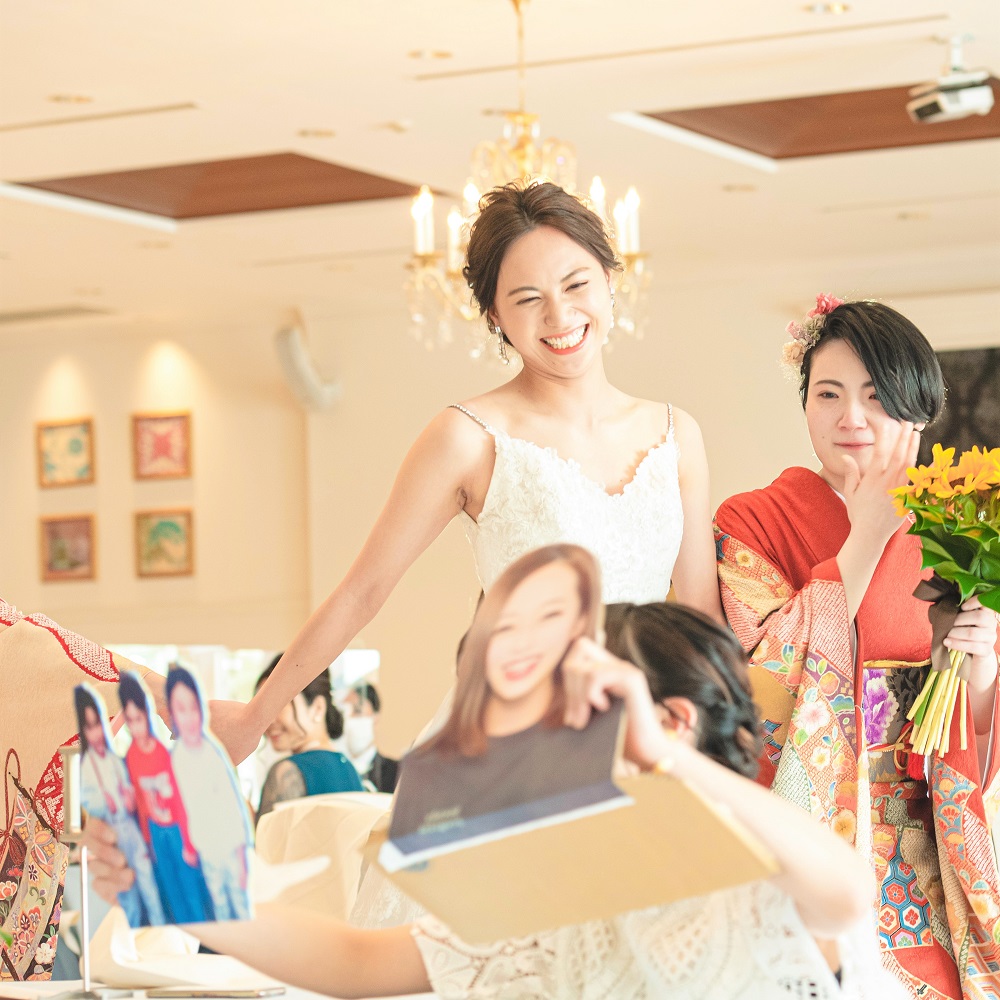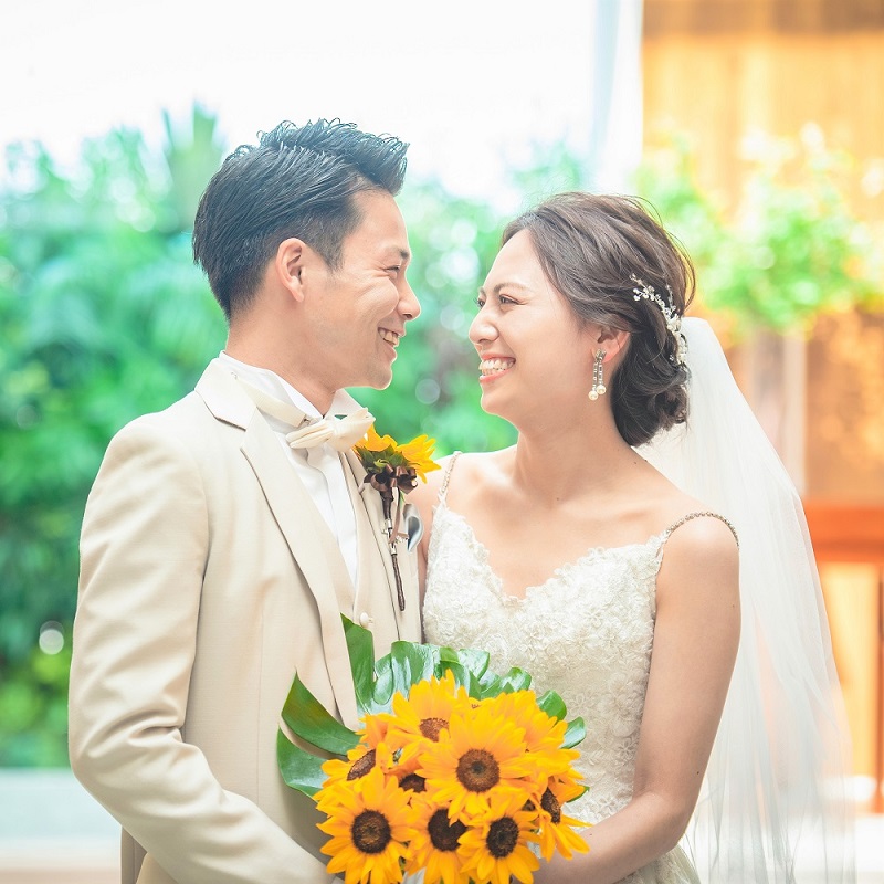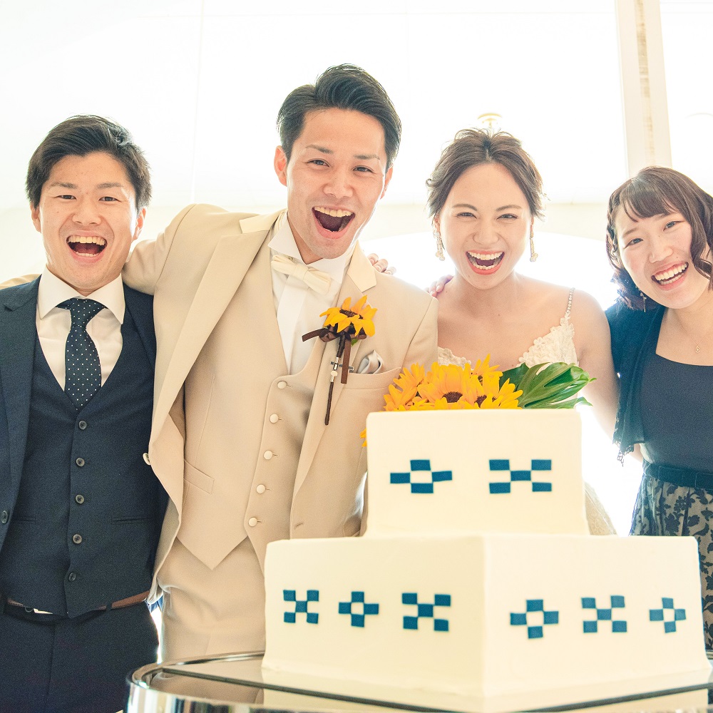 新婦が沖縄生まれで、新郎は沖縄に縁があり今では見た目も中身もうちなーんちゅの二人の大好きな沖縄をイメージした結婚式を挙げたいとテーマを考えました。沖縄には、ミンサー柄という伝統工芸があり、ミンサーとは、四角が五つと四つで〜いつ(五)の世(四)までも末永く幸せが続きますように〜との意味が込められています。そこで、挙式・披露宴の日取りを「5月4日」に決め、幸せが末永く続くように「ミンサーウェディング」というテーマに決めました。招待状やウェスカムスパースの看板、席札やウェディングケーキにもミンサー柄を取り入れました。