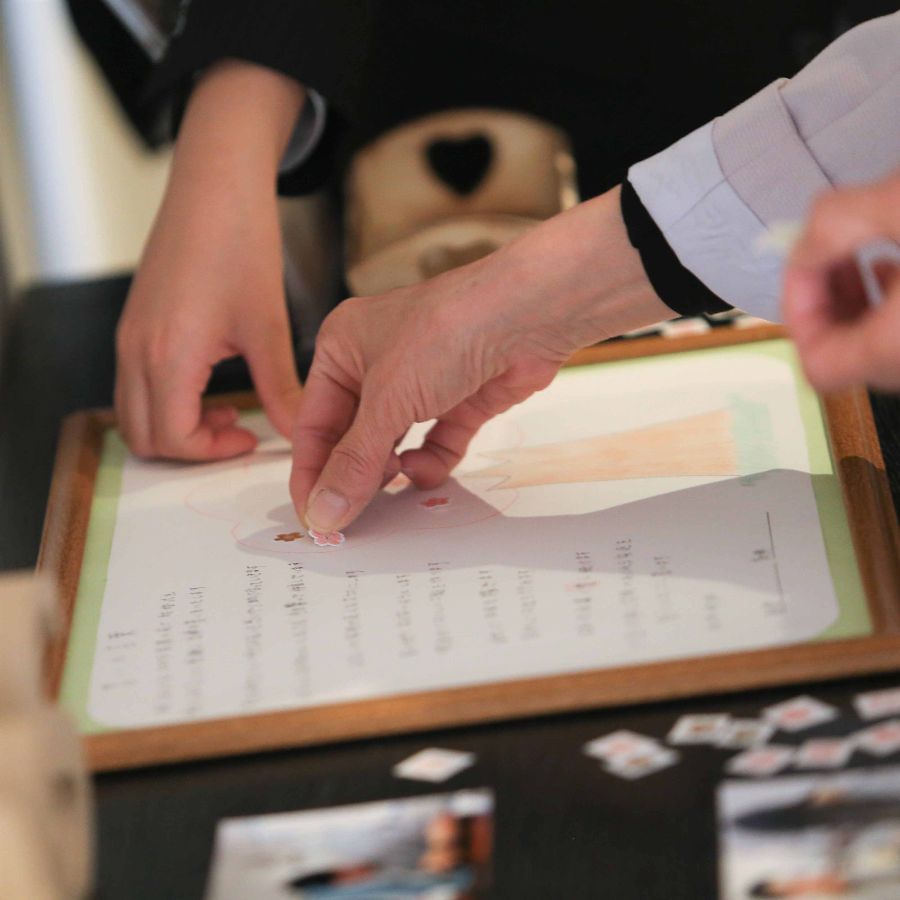 式場様でやっていただいている対策に加え、「受付でウェットティッシュを配布」「新郎ウェルカムスピーチで対策への協力を依頼」「受付の方に手袋を配布」「プチギフトを渡す際、新郎新婦も手袋とマスク」「席札兼マスクケースになっているものを使用」