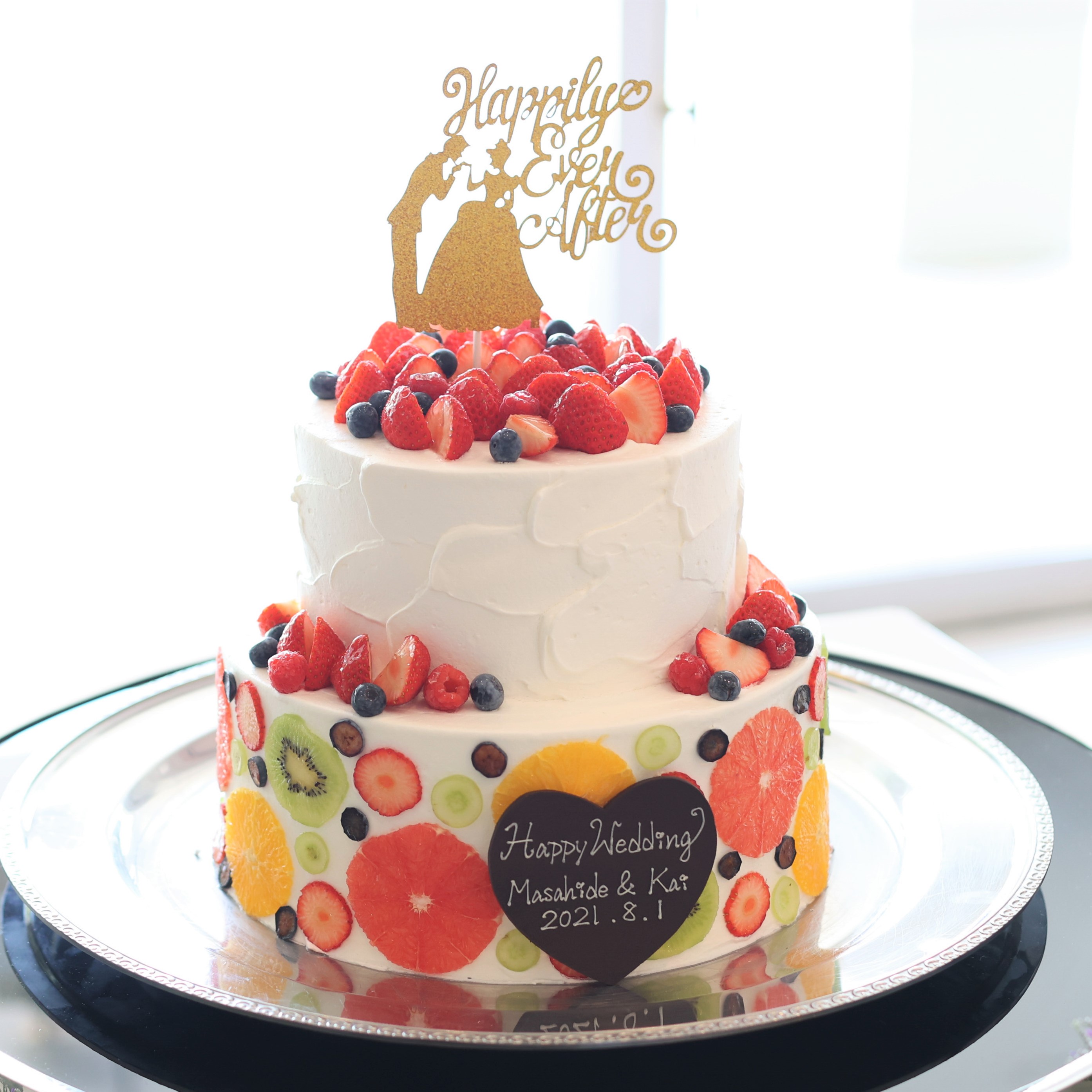 カラードリップをしたくて、ベリー系のピンクの可愛いフルーツソースを作ってもらいました。ケーキの下の段にはフルーツの断面が見えるようにしてもらい、とても可愛く、写真映えもばっちりでした!