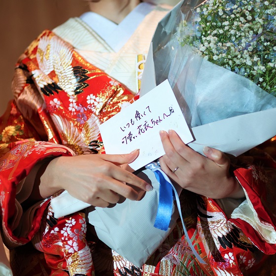 一番印象に残っているのは、緊急事態宣言と招待状の発送が重なってしまい、延期することを決めたときのことです。しょうがないと分かっていてもやはり悲しくて、落ち込んでいた私達でしたが、プランナーさんが一生懸命次の日取りを考えてくださり、2021年8月1日は、「2人は一緒、永遠に(∞)に一緒♡の日ですね!」と言ってくれました。私達のために一生懸命考えてくださっているその気持ちや姿に、心が明るくなり、とても励まされました。