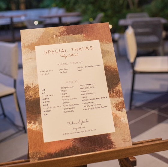 カッコよく登場し、カッコよく退場したいと考えており、洋楽をメインに使用したので、歌詞の意味を理解して、選んだ曲にふたりの思いを込めながら決めていきました。