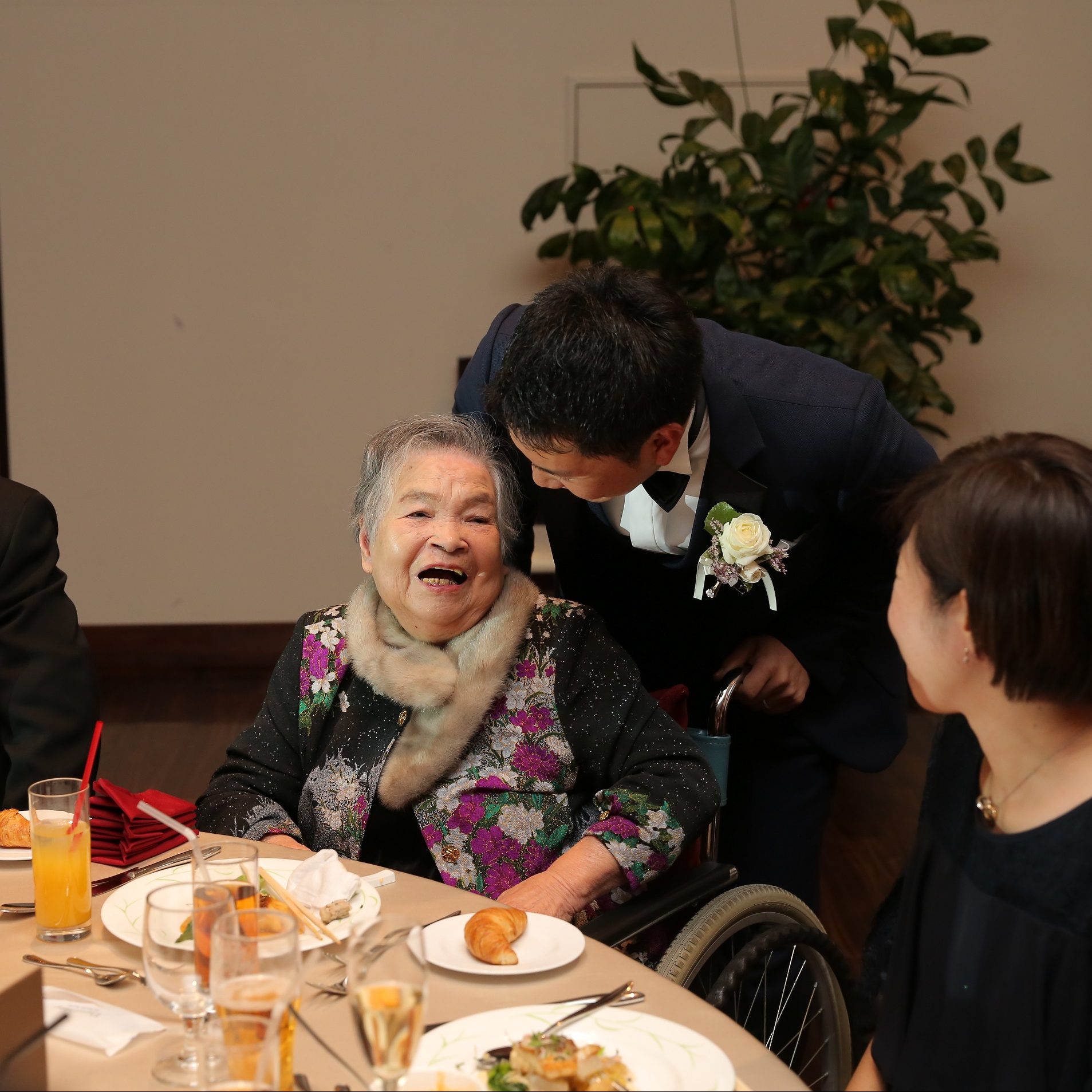 ケーキ入刀のサプライズバイトでは新郎新婦の特に仲のいい友人を呼んだり、中座の際には新婦はお兄ちゃんと、新郎は母代わりになって育ててくれたお婆ちゃんの車椅子を押してエスコートしました。