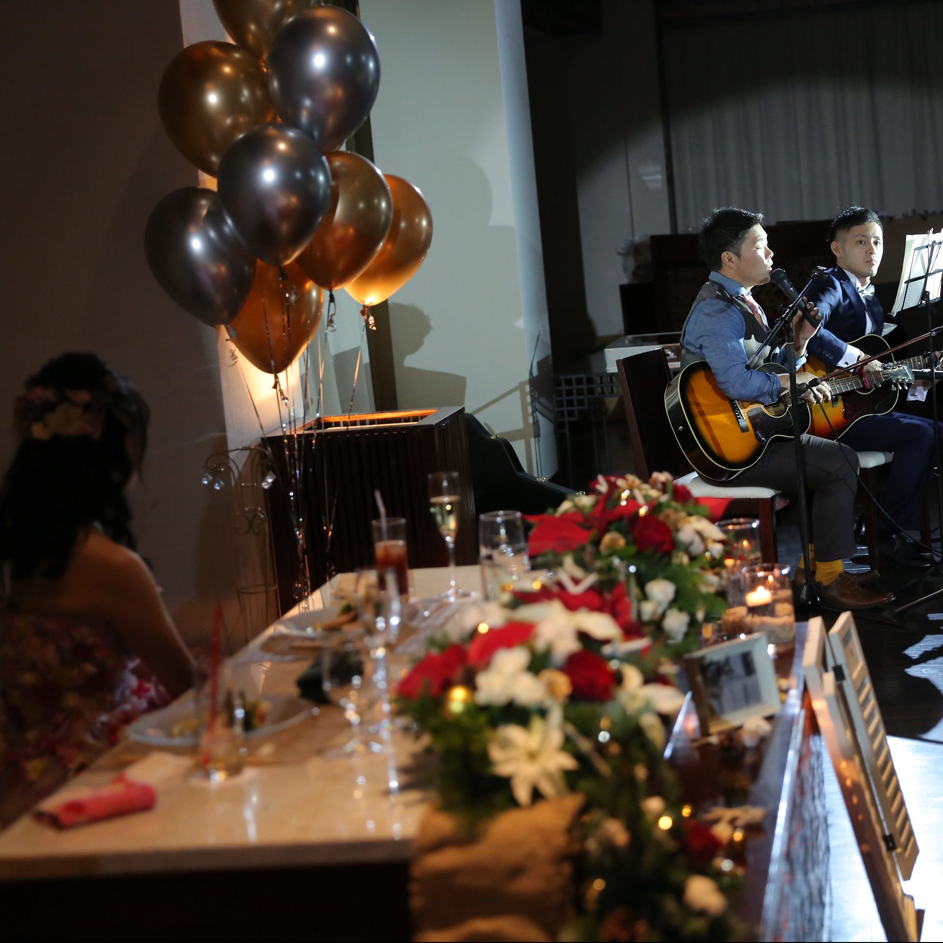 披露宴の後半には新郎から新婦へのサプライズでメッセージムービーを流した後、福山雅治さんの家族になろうよを趣味のギターで弾き語りしました。