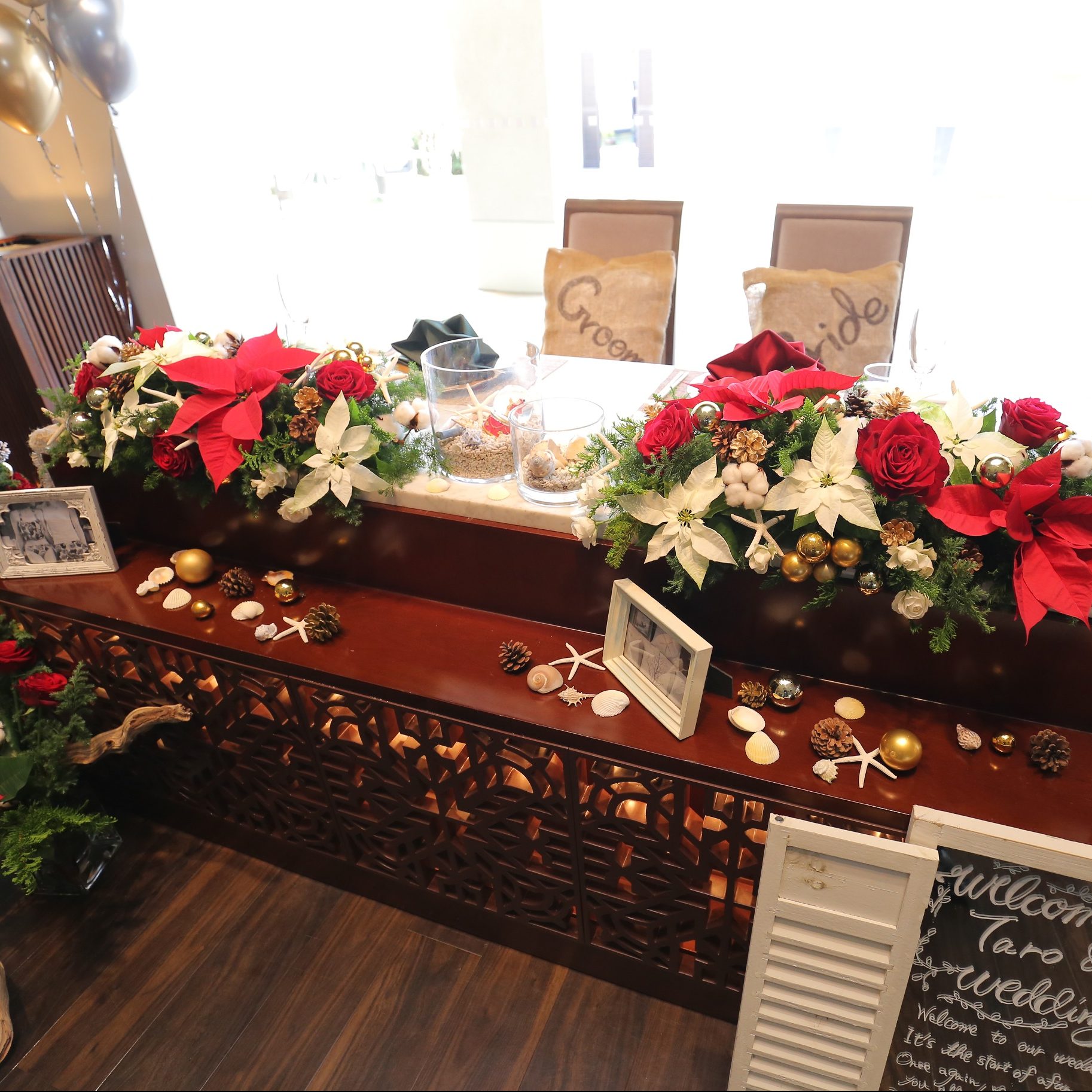 披露宴会場もそれぞれのテーブルクロスや装花、そしてメインテーブルの装飾、BGMやオープニングムービーもクリスマスパーティーの様な雰囲気を出したくて、プランナーさんと色々相談しながら決めました!
