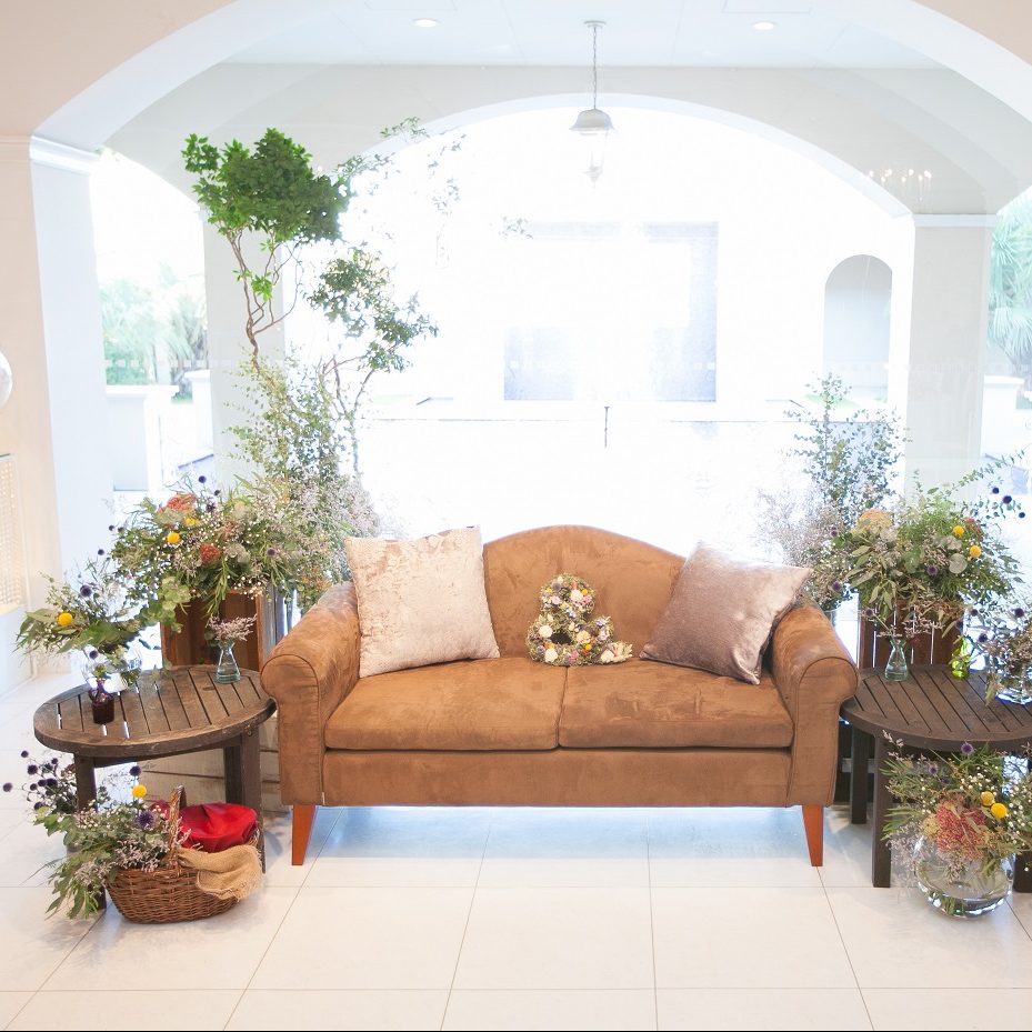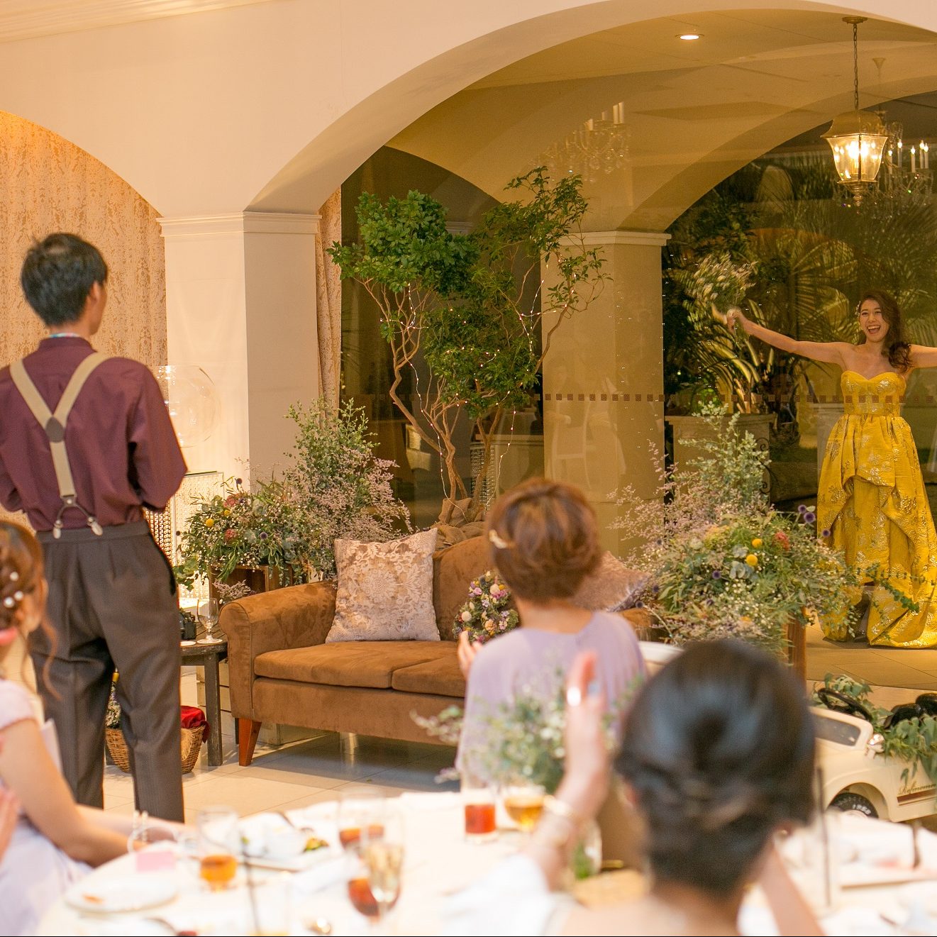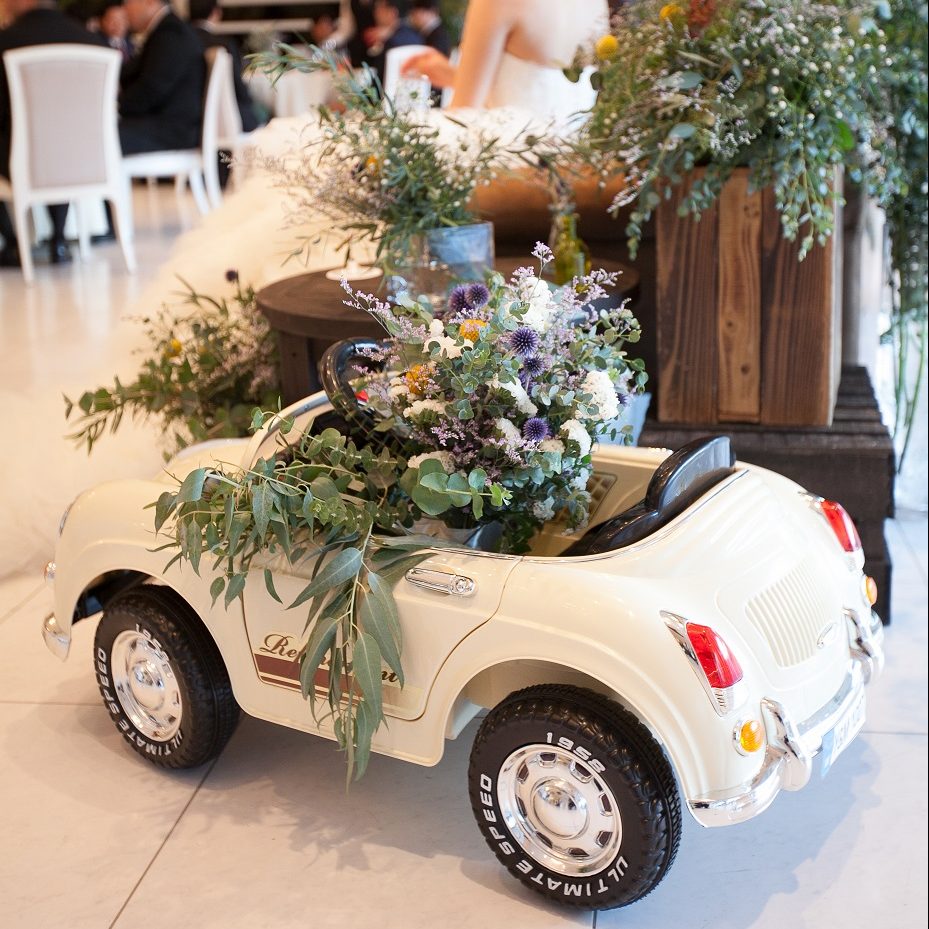 ゲストのみんなが楽しめる、笑顔の溢れる一日にすること、そして自分たちのやりたいことは全部やること。大きくこの2つにこだわりました。ゲストが楽しめる、という部分は、どんな式にしたいかをプランナーさんに伝えた上で一緒に考えてもらいました。結果的に披露宴の流れを少し変わった順番にして、新鮮な気持ちで過ごしてもらえるように。終了間近で見ることの多い親への感謝の手紙は前半に、後半はクイズの時間を作って笑って過ごす時間にしました。再入場の時には新郎が新婦の居場所を当てるゲームをしたり、プランナーさんが提案してくれた楽しげな演出も取り入れました。もう一つのこだわり、自分たちのやりたいことは全部!の方は、持ち込みが可能な部分に自分達らしいものを準備しました。引き出物のバッグは自分達でデザインして、ウェディングベールやアクセサリー類は友人や母に手作りしてもらいました。会場の雰囲気は植物好きの自分達らしくナチュラルに、かつ車好きの新郎のイメージを合わせて、ソファーの高砂に、挙式でリングガールが乗ったラジコンカーも置いて、披露宴中にブーケを置く飾りの一部にしてもらいました。ドレスは座った時のシルエットにこだわって、ドレスサロンにもギリギリまで何度も何度も試着におじゃましましたが、とても丁寧に対応して頂きました。最終的に持ち込みの多かった新郎のお色直しの靴下の色まで相談に乗って頂きました。