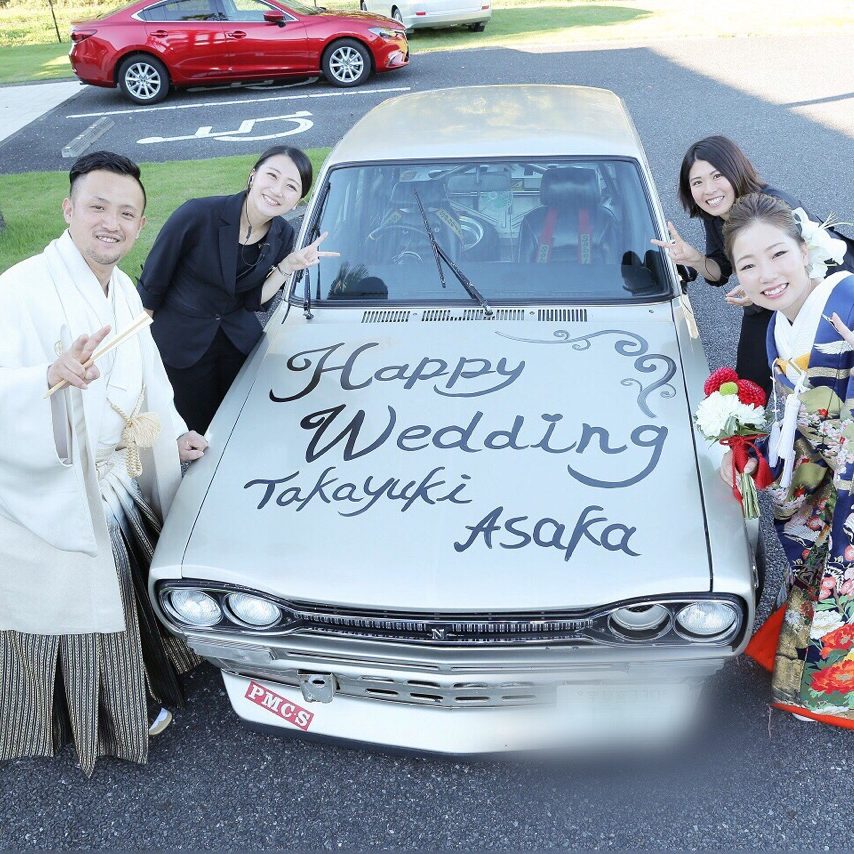 会場にウェルカムカーとして、大好きなハコスカを置かせていただきました。ハコスカにもインパクトのあるペイントを自分達で行い、みんなからも2人らしいというお言葉をいただきました。