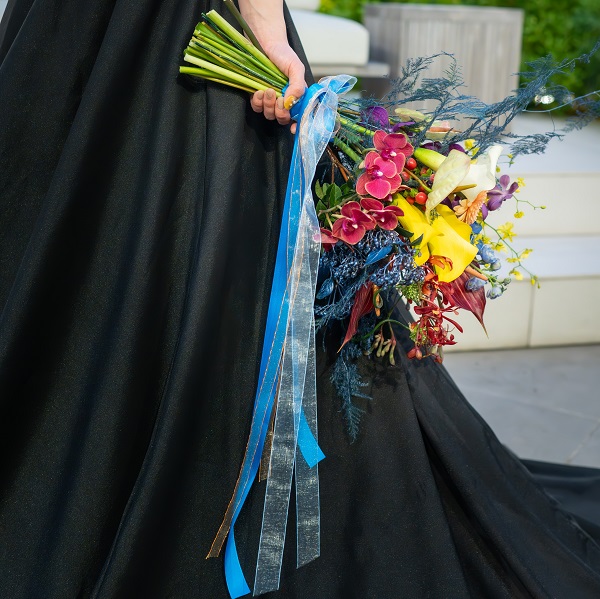 装花 ブラックのカラードレスを着たかったためそのドレスが最大限に引き立つように会場をカラフルにしました。