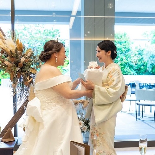 ご新郎からご新婦父にブートニアを渡す際