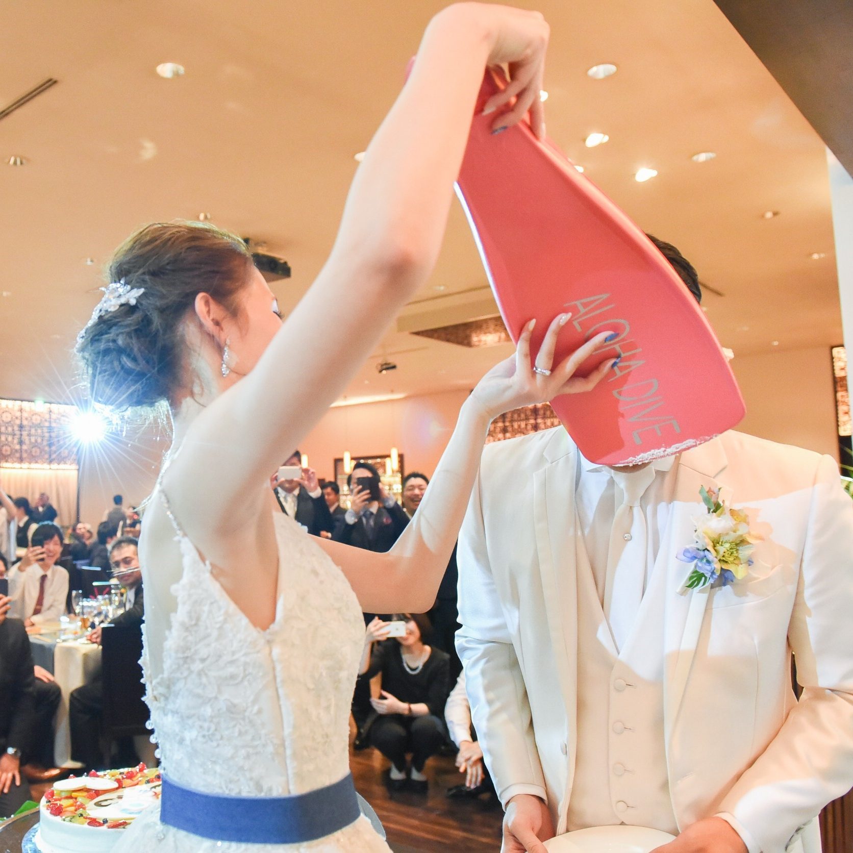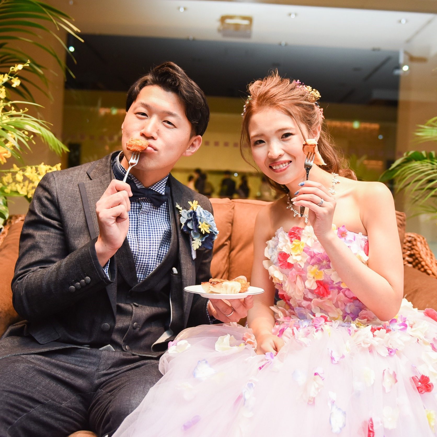 全体を通して私たちらしい、堅苦しくなく、お笑い要素がいっぱいの楽しい結婚式になりました。かっちりした披露宴というよりは、アットホームな雰囲気にしたかったのでバッチリでした。そして、会場内で1番楽しんでいたのは間違いなく自分たちだと思います!