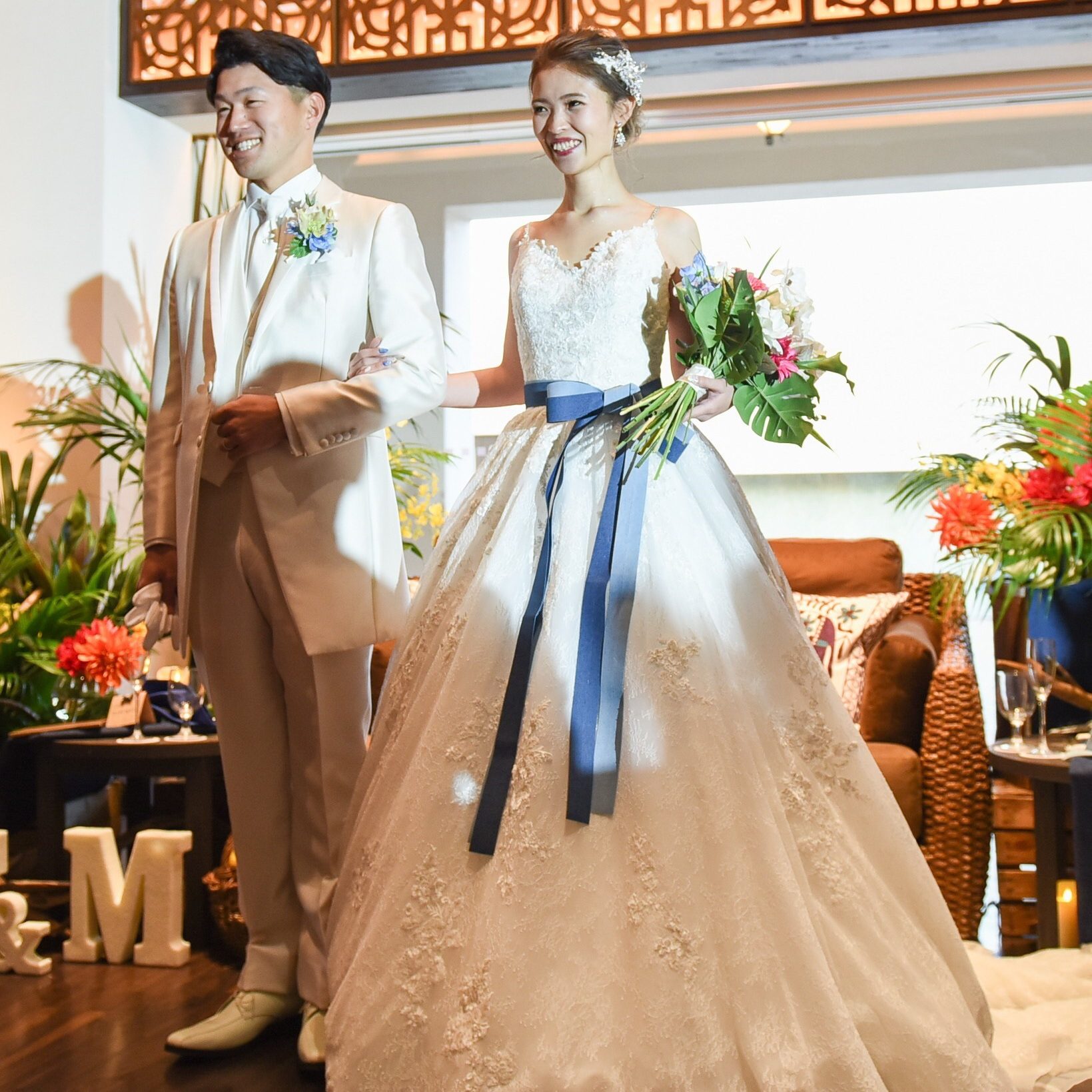 ウェルカムスペースにデニムコーナーを設けたり、フラワーシャワーにデニムリボンを混ぜたり、会場全体の装花や手作りブーケをリゾート風にしたり、テーブルランナーをデニムにしたり、引出物バックをジュートバッグにしたり……とにかくテーマを前面に押し出しました。私たちもウェディングドレスにはデニムリボンを巻き、お色直しはデニムタキシード、会場のキャストさんにはジーンズの着用をお願いしました。