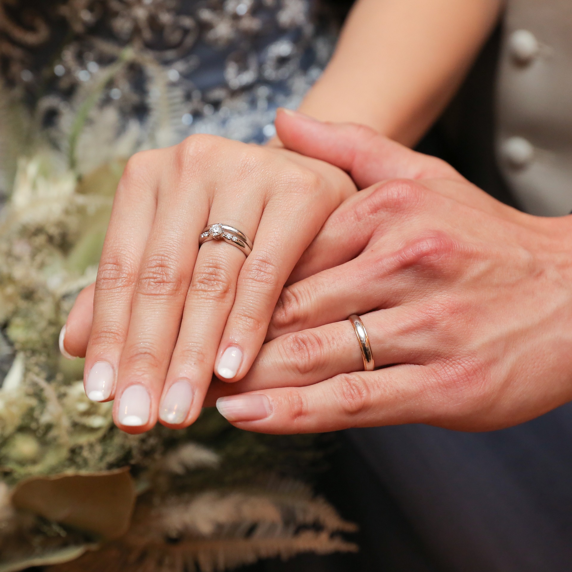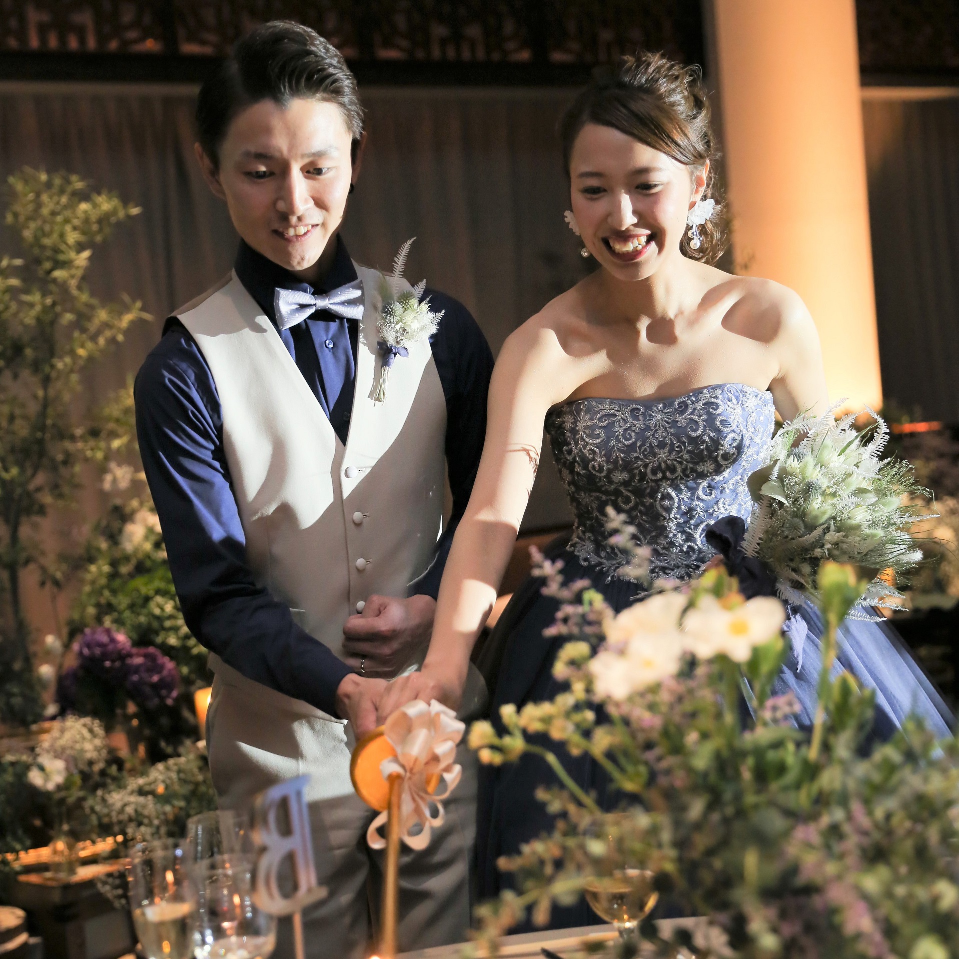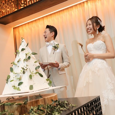 結婚式の雰囲気はナチュラルでアットホームな感じが良かったため名前にもある「森」をテーマに皆さんに来て良かったと思ってもらえるような結婚式を考えました。プランナーさんには細かいところまで色々わがままを聞いていただきましたが嫌な顔一つせず私たちのイメージ通りのプランを立てていただきました。ケーキは三角の形にしてもらいオリジナリティをだしました。プランナーさんにも色々アイデアを出していただきオシャレな雰囲気にすることができました。合わせてコーディネートも三角をイメージしてテーブルクロスの折り方にもこだわりました。自分たちのイメージに合うようペーパーアイテムは全て手作りしました。招待状のデザインから紙も自分で選び、世界に一つしかない招待状を作ることができました。式場の雰囲気に合わせたメニュー表や席札、エスコートカードも手作りしました。ゲストの方も手作りにとても驚いてくださり、心を込めて作って良かったです。高砂は見学のときから良いなと思っていたソファ席にしました。ゲストの方との距離も近くアットホームな感じにすることができました。写真を撮るときもドレス全体が写ったり、ゲストの方と話しやすかったり、とても好評でした!テーマの森に合わせグリーン系を中心に高砂のアイテムや花にもこだわりました。料理は前もって試食会がありましたが休みの合わない私たちのために試食会の時間をずらしていただきました。自分たちがきちんと美味しいと思った料理を出すことができ、とても感謝しています。味付けを食べやすいものに変えたりや男性ゲストの方にはおにぎりを出したりとゲストの方にも美味しいといってもらえる物を出すことができました。