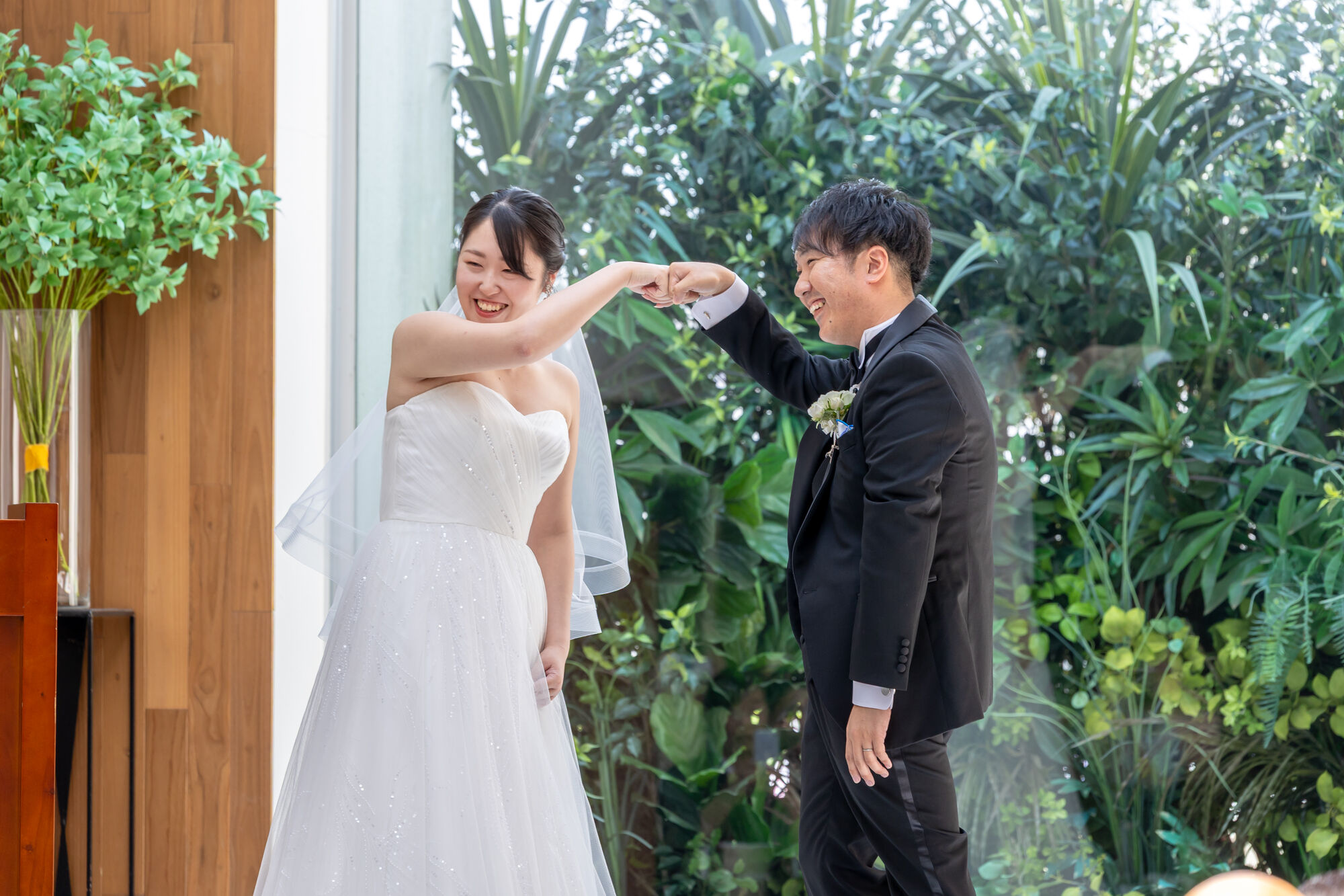 挙式では、おふたりが一生懸命考えられたオリジナルの誓いの言葉に続き、見守るゲストも思わず笑顔になったのが「誓いのグータッチ」です。 形式にとらわれず、おふたりらしく拳を合わせる姿に、「ふたりらしいね!」と温かな声が上がった素敵なシーンでした。