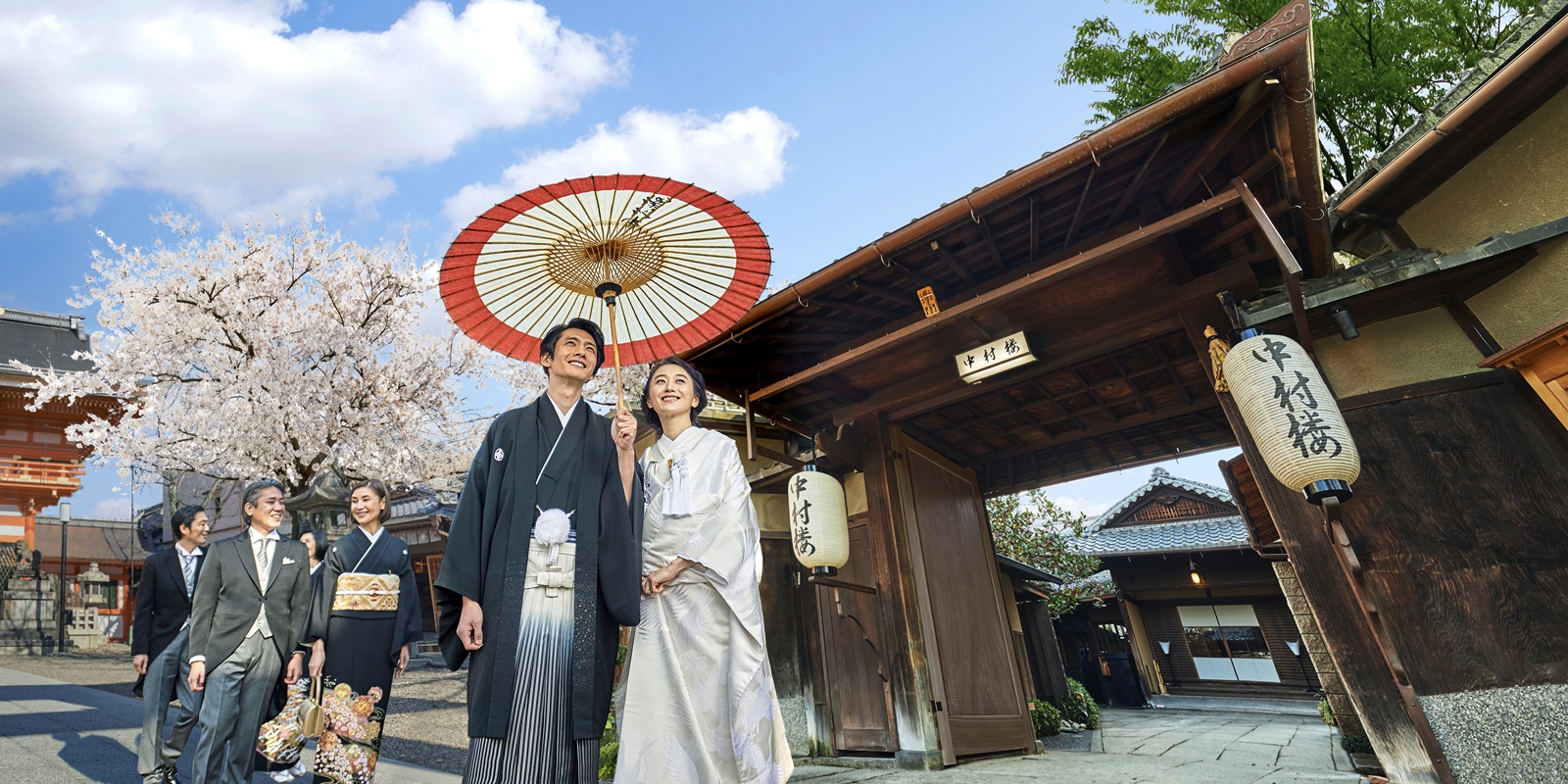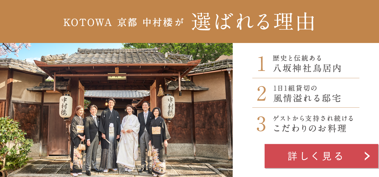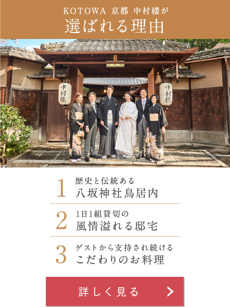 祇園四条駅から徒歩5分。KOTOWA 京都 中村楼は、祇園祭で有名な八坂神社の鳥居内にある唯一の式場です。