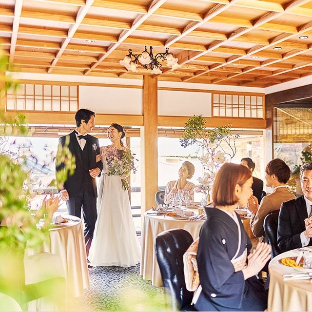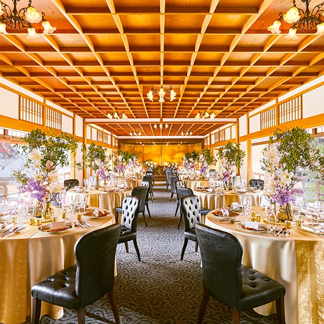 心地よい陽光が降り注ぎ、木の風合いも柔らかな会場は、上質で洗練された雰囲気。窓から眺める四季折々の庭園の景色も美しく、日本伝統の格子細工や金屏風、舞子台などが伝統と風情を醸し出します。また、スクリーンやプロジェクターをはじめとする映像・音響設備も充実。ご希望のパーティースタイルに合わせて、自由にお使いいただけます。