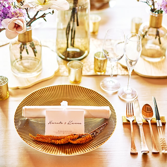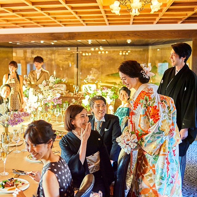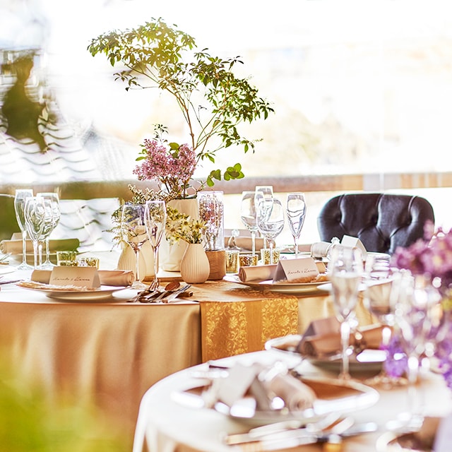 館内には庭園を望むパーティー会場に加え、受付やウエイティングスペースとしてご利用いただけるラウンジ、控室として活用できる個室など、充実した空間と設備をご用意しております。また、パーティーを盛り上げる多彩な演出もお愉しみいただけます。