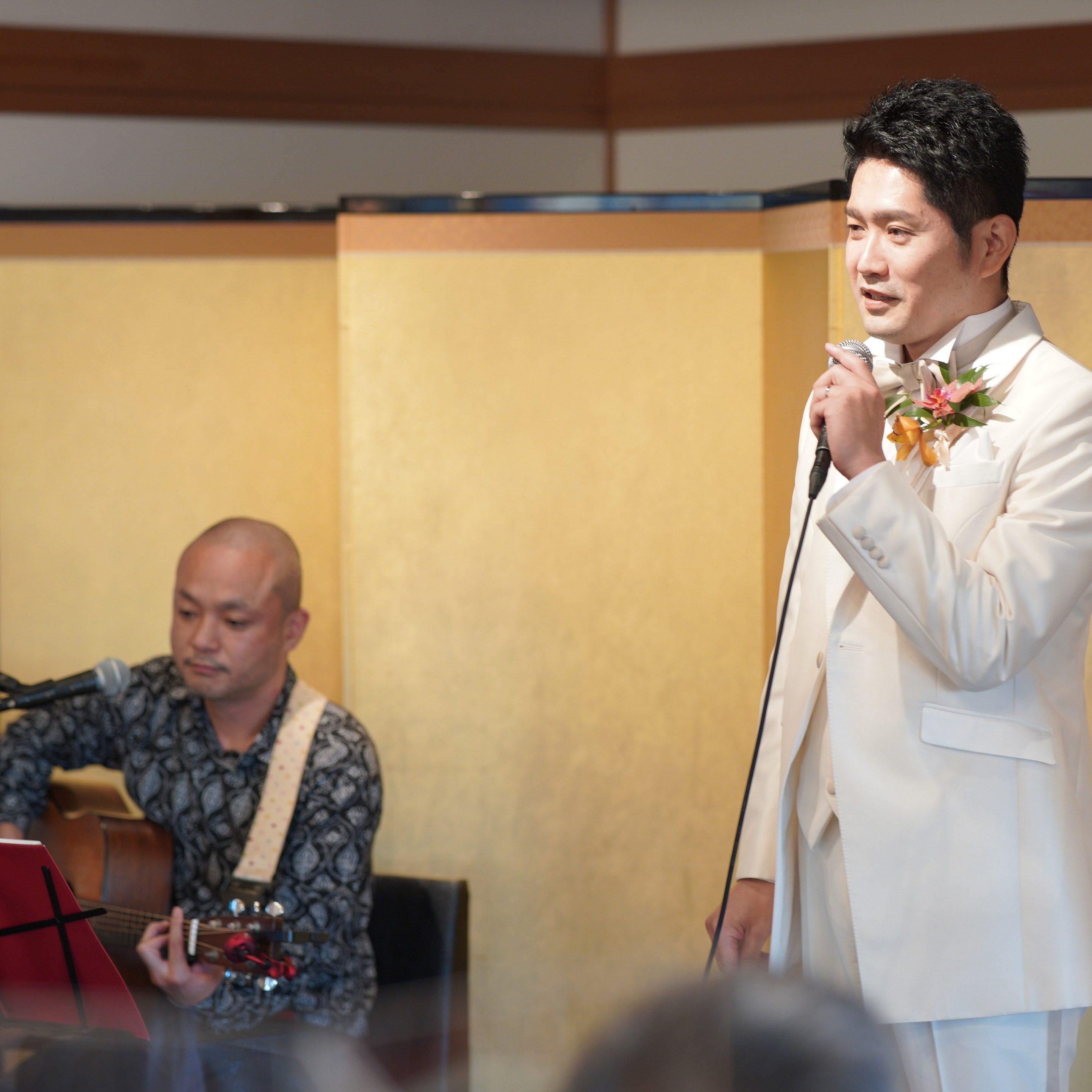 新郎新婦による歌の披露、新郎友人による生歌、生演奏とイベント盛りだくさんにしました。