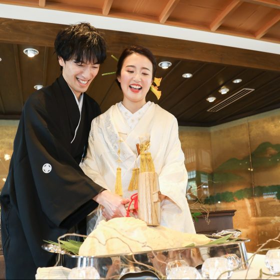 鯛の塩釜開きも印象的でした。友人の挙式に参加することも多く、ケーキ入刀の場面をよく見ており、少し違ったことをしたいと考えていたので、みんなの驚く顔が見られて良かったです。なかなか割りがいのある塩釜だったことも良い思い出です。