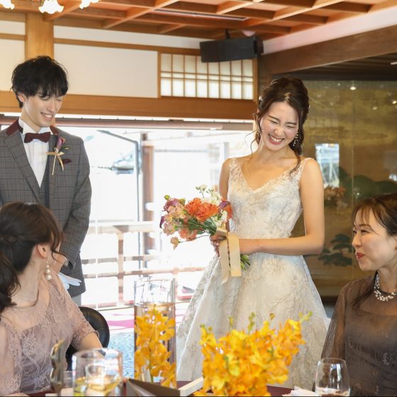 和装と洋装で迷っていて、どちらかに絞らないといけないなと思っていましたが、KOTOWA 京都 中村楼の雰囲気がどちらのスタイルにも合っていたので、両方の希望を叶えられると思い選びました。また、八坂神社が近いこともあり、挙式をチャペルと八坂神社とで選べる点も魅力的でした。遠方から来る親族や友人が多く、せっかく京都で式をあげるなら思い出に残るものにしたいという2人の希望がありました。雰囲気や挙式で迷っていたからこそ、いろんな希望に対応してくれる点が1番の決め手になりました。