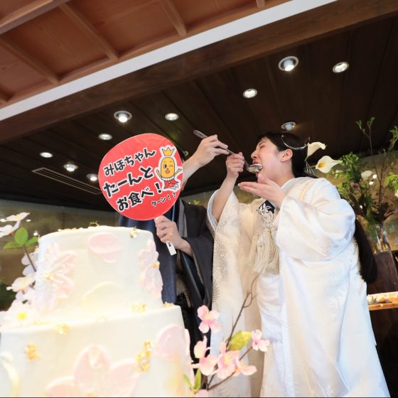 退場は、事前に待ち合いスペースのお茶屋さんでゲストに書いてもらったファンサ団扇を振ってもらい、『ハート作って』『エアハグして』など書かれたゲスト手作りの団扇に新郎新婦が一つ一つ対応しながら退場しました。