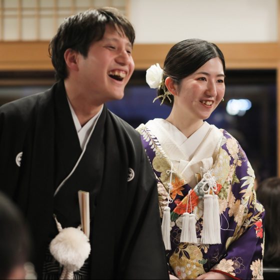 結婚式・披露宴を通じて衣装は和装(白無垢・色打掛)で、歴史ある建物が会場であったため、