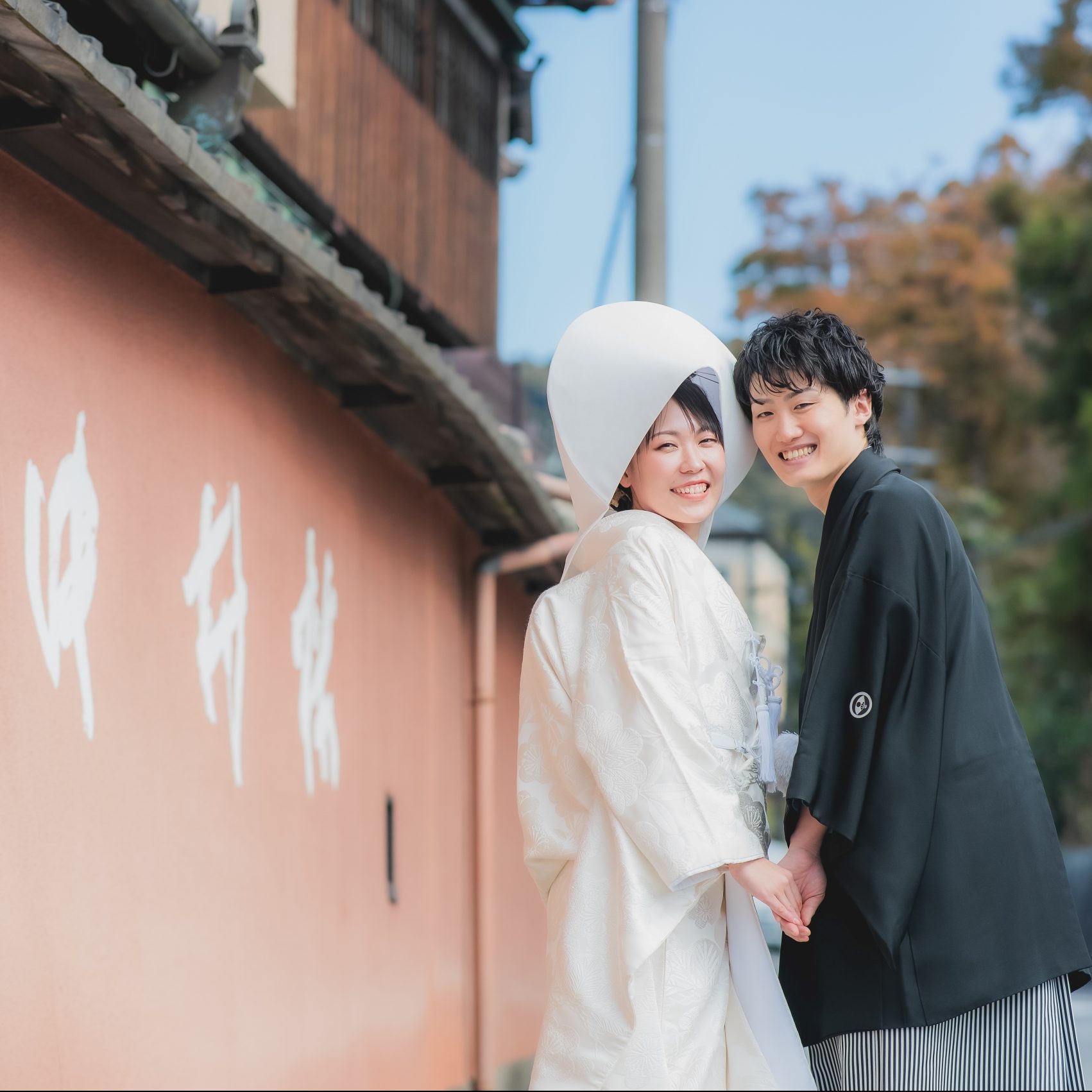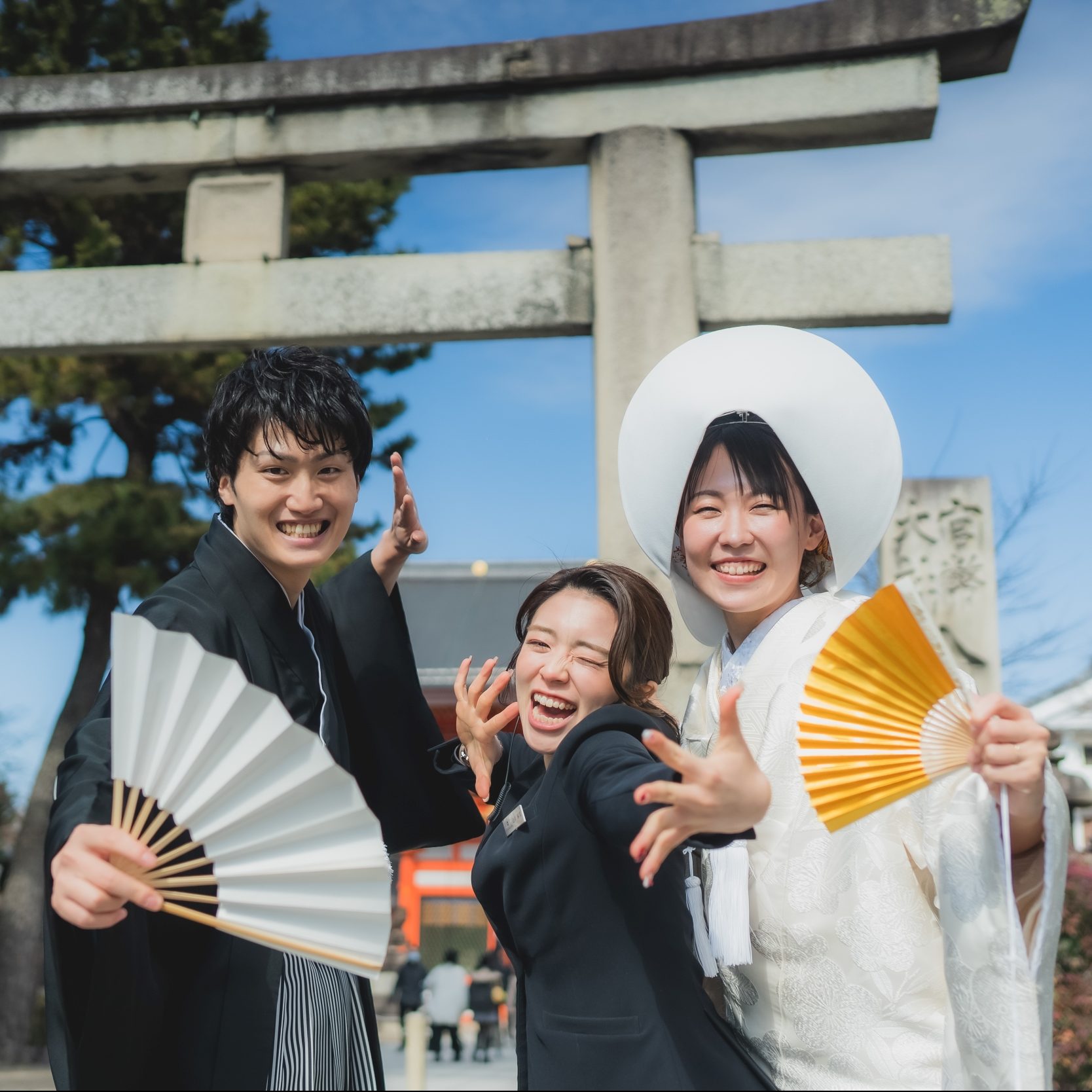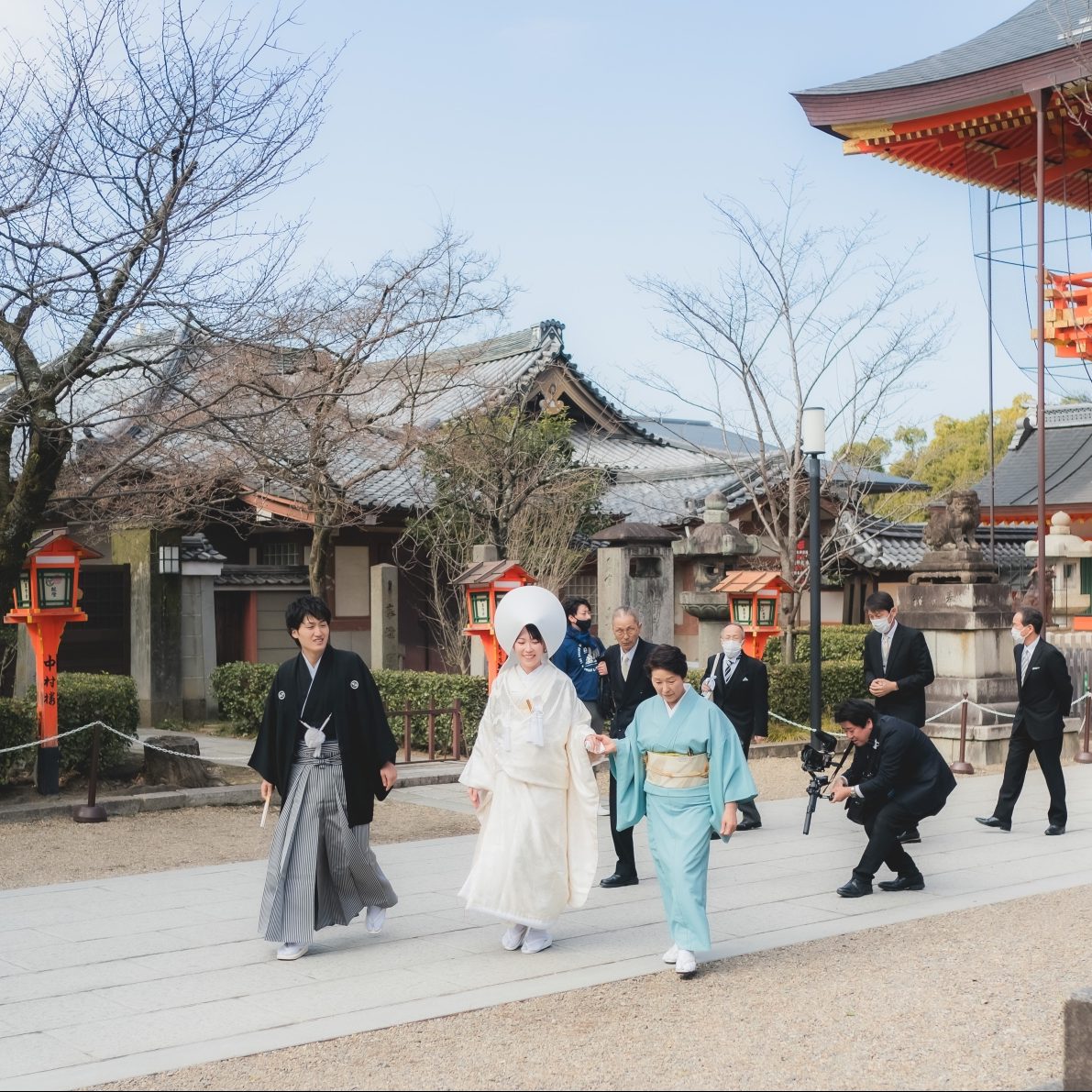 親族だけでなく友人の皆さまにも式の様子を見てほしいと考え、八坂神社の中央に位置する舞殿での挙式を選びました。まだ肌寒い2月中の式ということもあり天候が心配でしたが、当日は天気にも恵まれ、時間をかけて境内での写真撮影ができました。親族ともゆっくり会話する時間がありお互いにとても喜んだことを覚えています。花嫁行列の時には想像以上のギャラリーで驚きましたが、観光客の方からもお祝いの言葉を頂けて嬉しかったです。日本の伝統的な挙式で行えたことは大変良い思い出になりました。