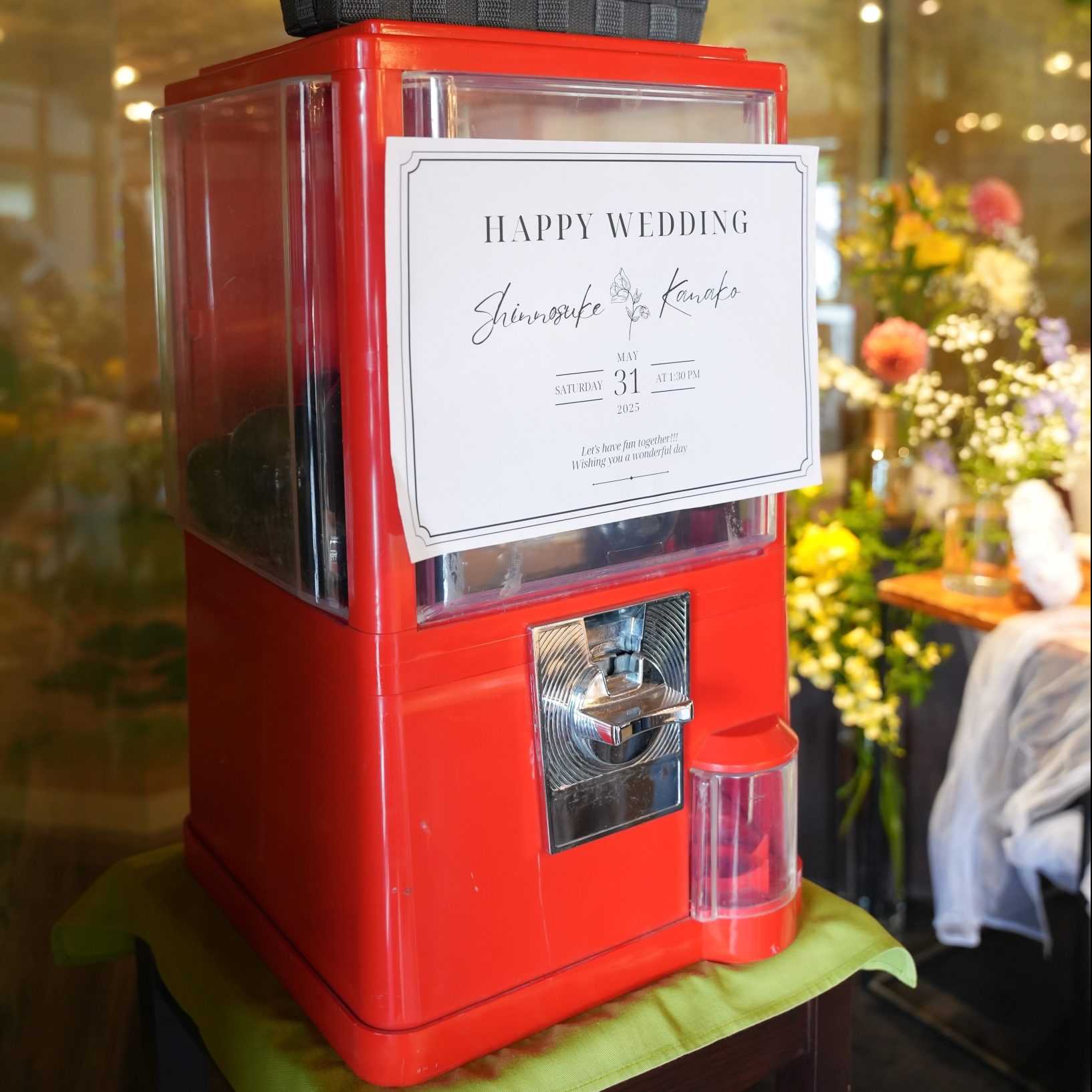 「平成のあの頃を思い出す」という披露宴のコンセプトに合わせて、平成時代に流行したプロフィール帳(サイン帳)を用意したり、幼少期に誰もが憧れたガチャガチャを取り入れ、カプセルの中には写真用のポーズカードを仕込んだり、平成イントロドンをしたり…。