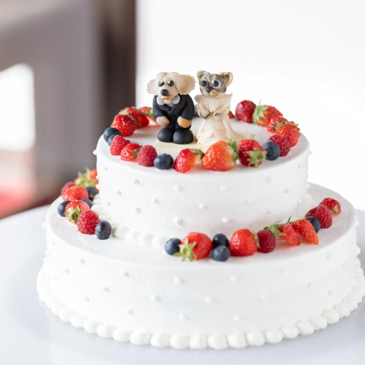 夫婦共に実家でペットを飼っており、家族の一員として披露宴には参加できませんでしたが、新郎はウェディングドレスの飼い猫、新婦はタキシード姿の飼い犬のマジパンのケーキトップを作っていただきました!ゲストの皆さんにも沢山写真を撮っていただき喜んでいただけました。テーブルコーディネートはゲストの方が多くなかったので、大きなお花を用意して華やかにしていただきました。また、新婦が大のGLAYファンでしたのでお色直しでライトグレーのドレスにGLAYのBGMで入場した事はこだわりポイントです(笑)