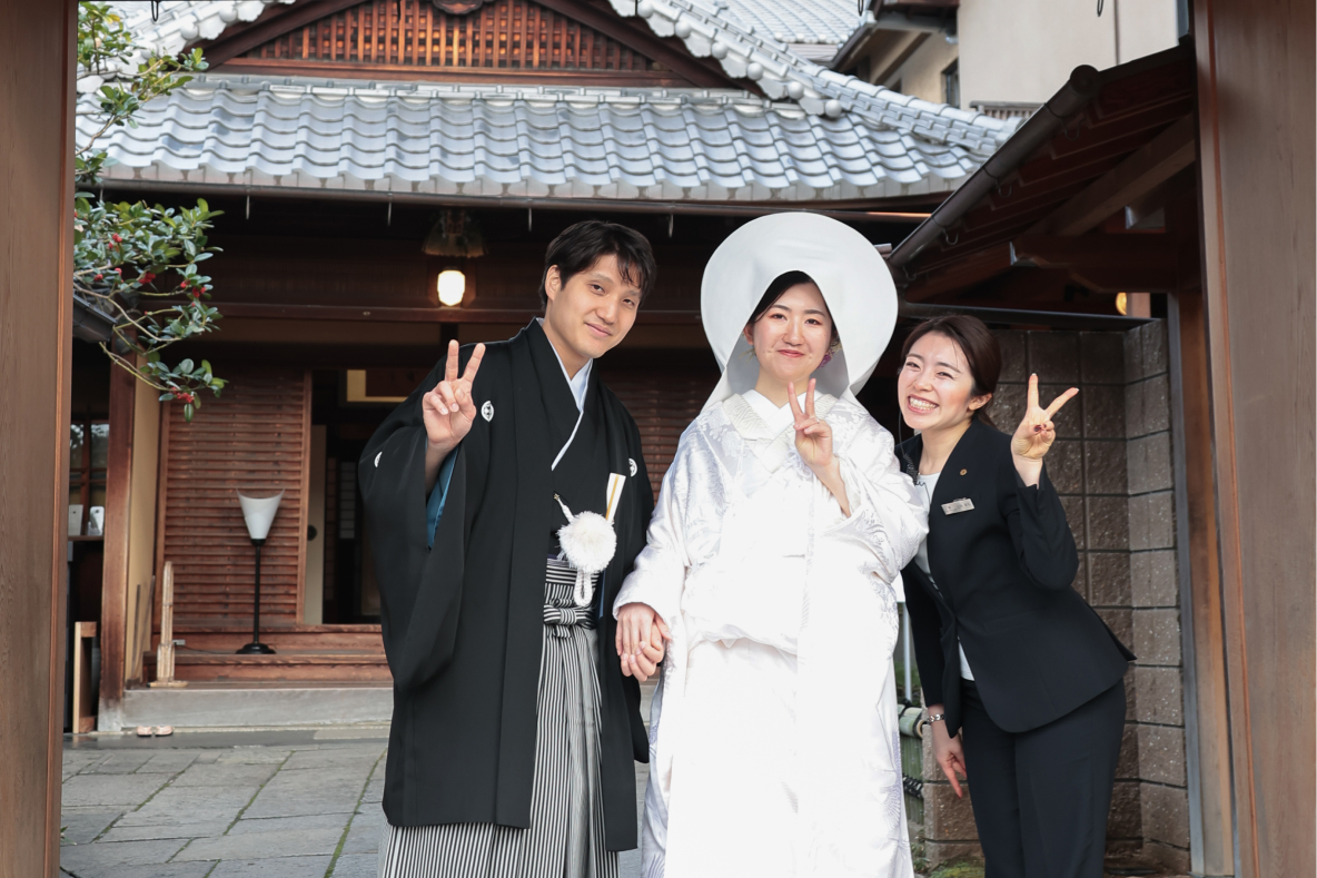 八坂神社の本殿で、重要文化財の重みを感じながら愛を誓いたい。そんな明確な想いをお持ちだったともひこ様とひろか様。 「ゲストに和の雰囲気を存分に味わってほしい」「美味しいお料理をゆっくり楽しんでほしい」という、おもてなしの心を大切にされるおふたりでした。 遠方にお住まいのため、お打ち合わせの多くはオンラインでしたが、いつも丁寧にご準備を進めてくださる姿が非常に印象的でした。