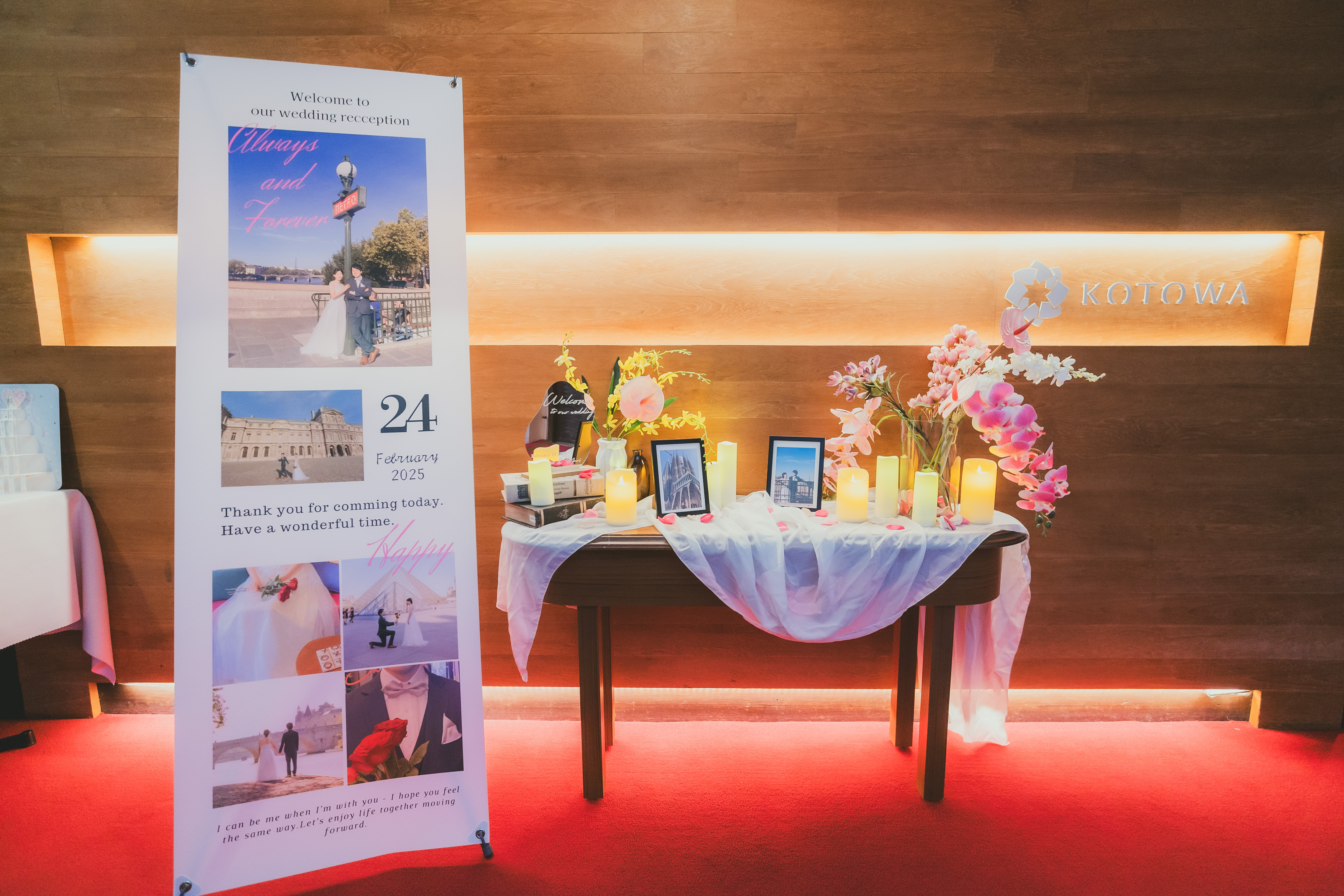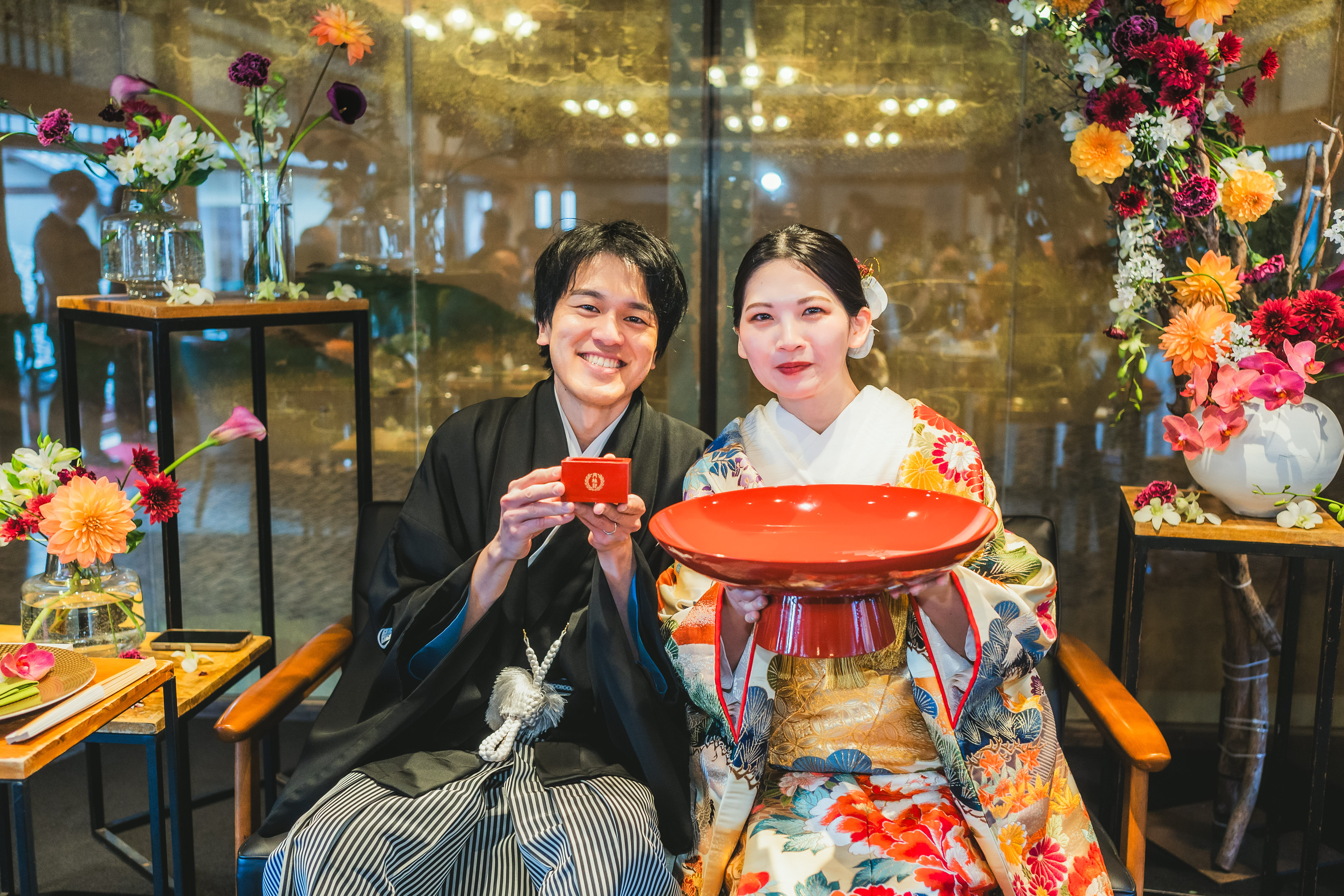 京都の歴史ある場所で、神前式を挙げたいと願っていたけいご様とまり様。 新郎・けいご様は高知のご出身で、会場となった中村楼が坂本龍馬ゆかりの地であることにも深いご縁を感じてくださいました。 どんな時も楽しむことを大切にされたいという素敵なおふたりの結婚式のテーマは、「自分たちが思いきり楽しむ」とともに「ゲスト全員に感謝を伝え、ご結婚式の1日を楽しんでもらうこと」。 上品で重厚感のある和洋折衷の空間で、大切な皆様をお迎えする準備が始まりました。
