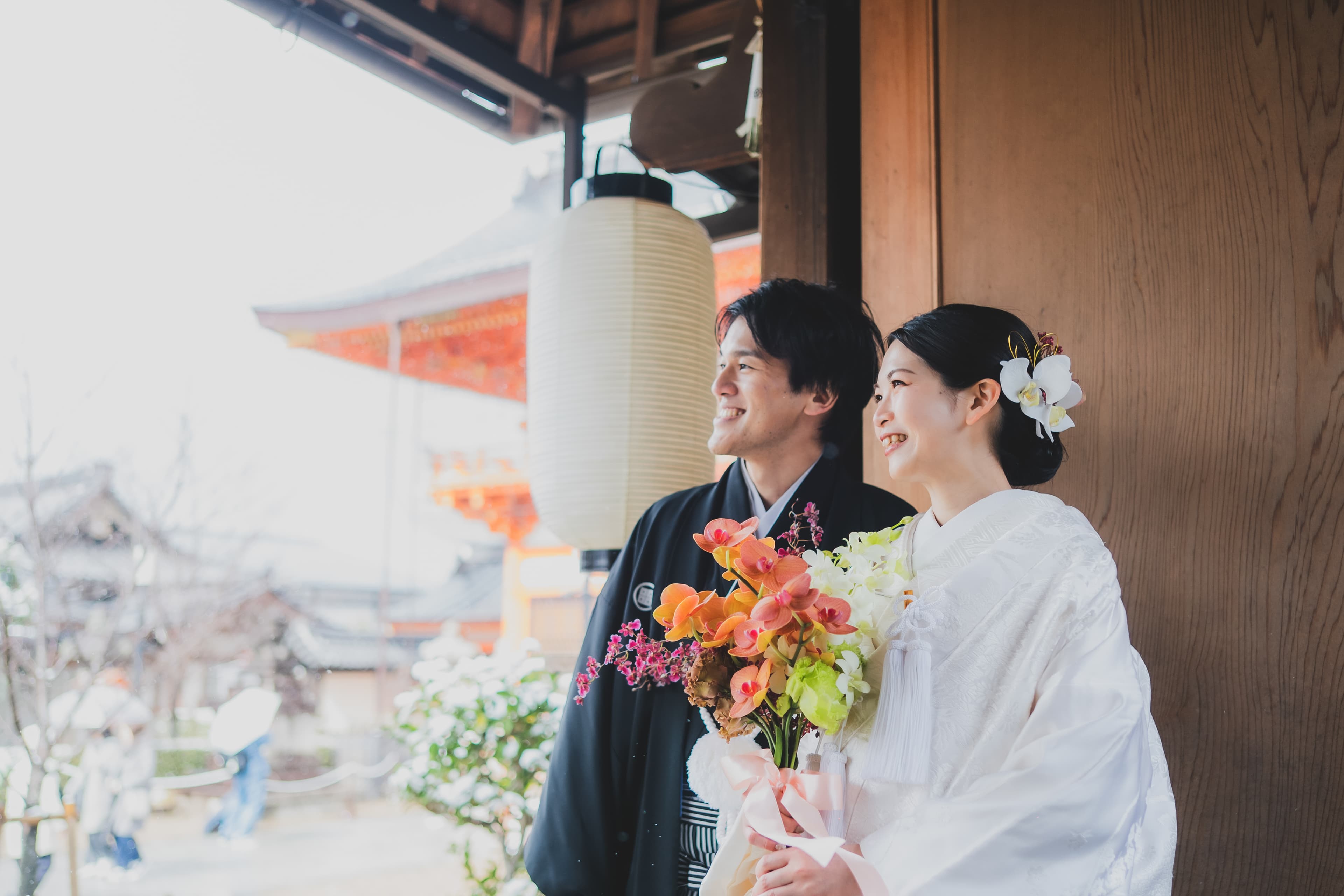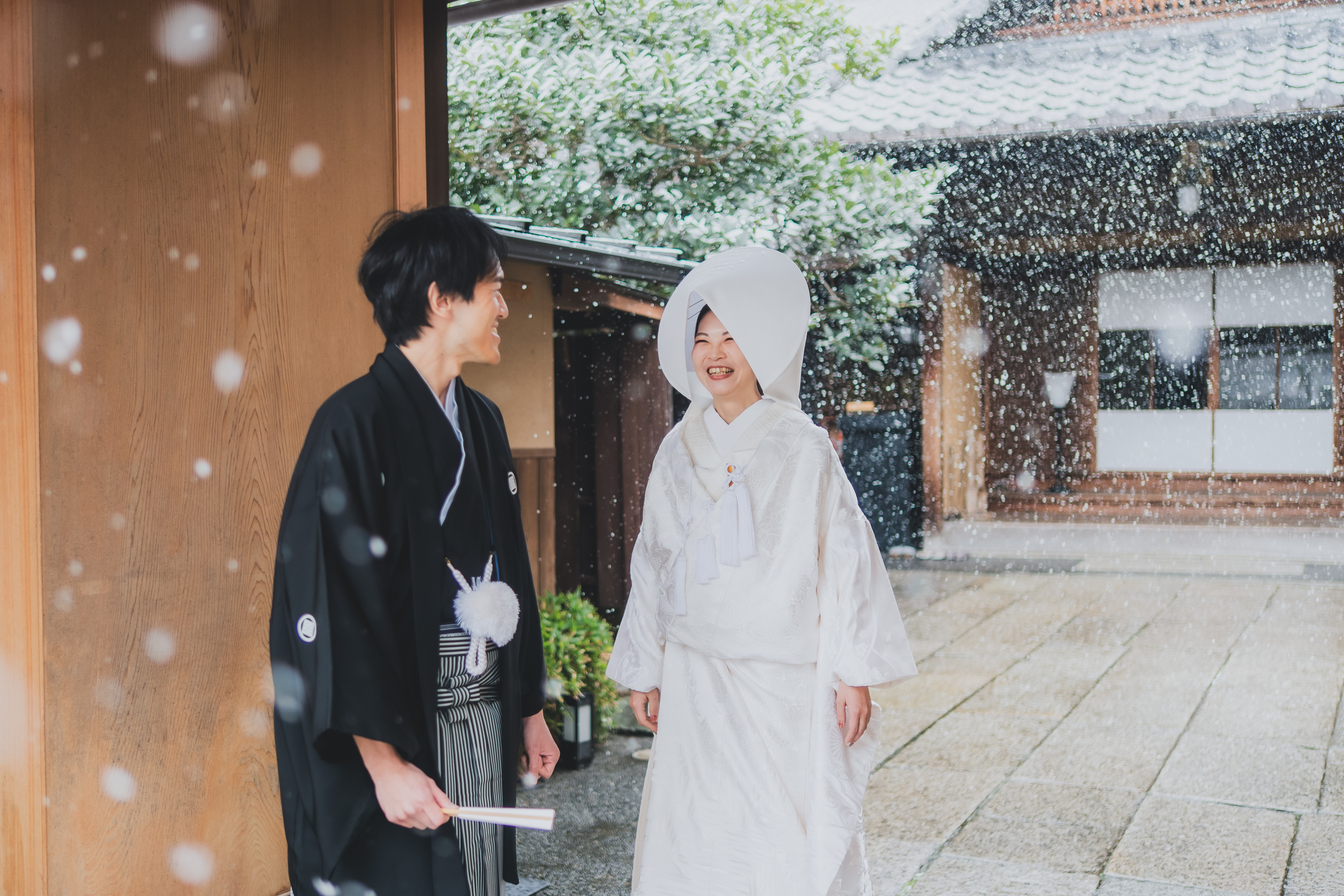 しかし、しんしんと降り積もる雪はおふたりを祝福する幻想的な演出となり、八坂神社での参進の儀は、まるで映画のワンシーンのような美しさでした。