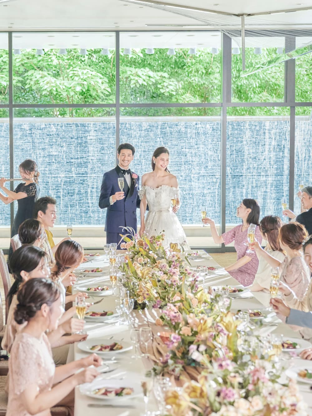 伝統とモダンさが調和したAYANEは、和装と洋装、どちらにも映えるスタイリッシュな空間。屋外には滝の流れる専用テラスがあり、自由なスタイルでパーティーをお愉しみいただけます。多彩なコーディ―ネートが似合う空間で、おふたりの理想のスタイルを形にしてください。