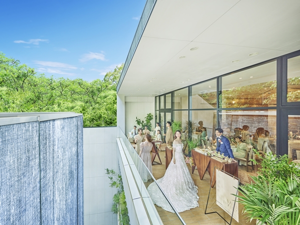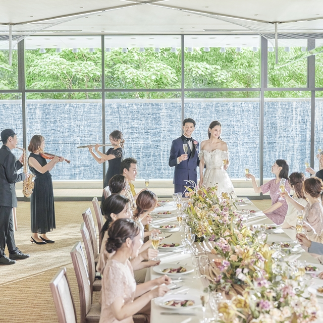 伝統とモダンさが調和したAYANEは、和装と洋装、どちらにも映えるスタイリッシュな空間。屋外には滝の流れる専用テラスがあり、自由なスタイルでパーティーをお愉しみいただけます。多彩なコーディ―ネートが似合う空間で、おふたりの理想のスタイルを形にしてください。