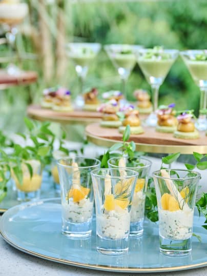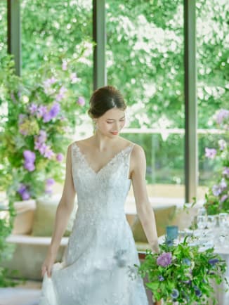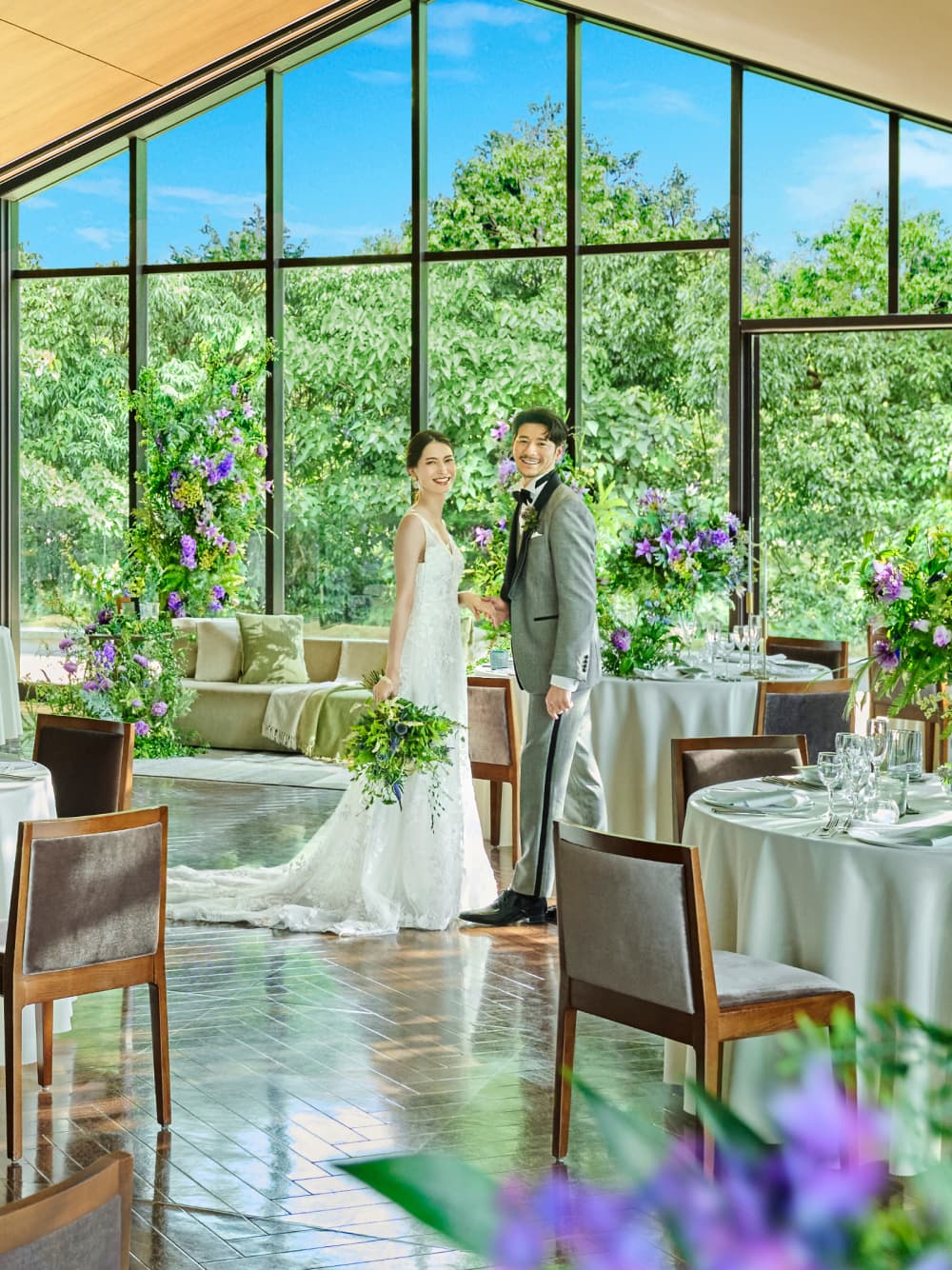 HARUKAには緑を間近に眺められる専用の屋外テラスがあり、デザートビュッフェなど自由な演出をお愉しみいただけます。緑と一体化したナチュラルな空間は和にも洋にも調和し、多彩なコーディネートやアレンジでおふたりのイメージを形にできます。