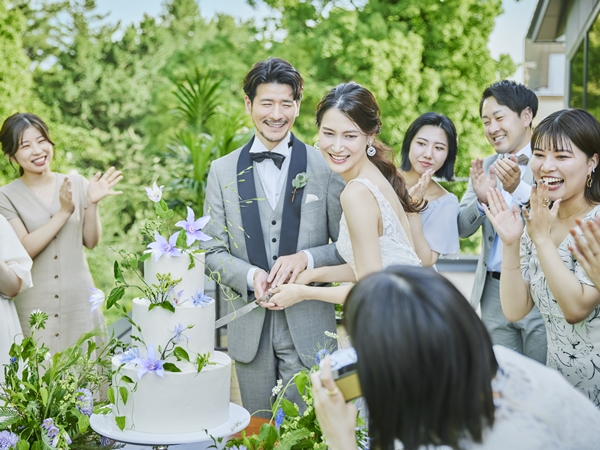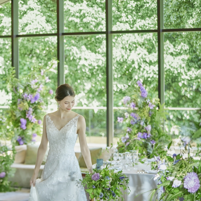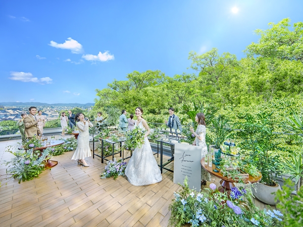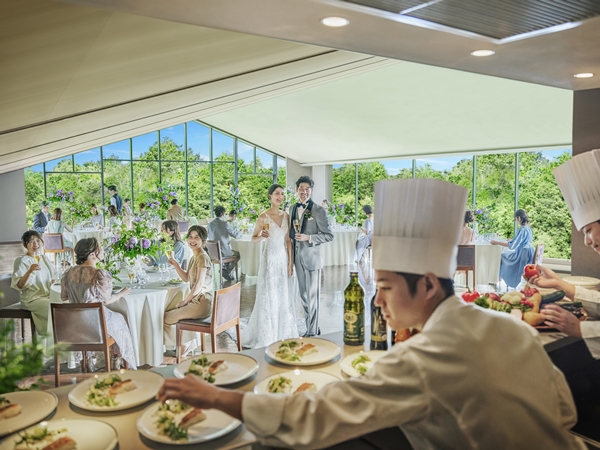 HARUKAには緑を間近に眺められる専用の屋外テラスがあり、デザートビュッフェなど自由な演出をお愉しみいただけます。緑と一体化したナチュラルな空間は和にも洋にも調和し、多彩なコーディネートやアレンジでおふたりのイメージを形にできます。