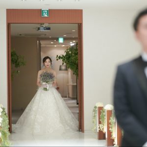 振り返っていただくのをドキドキしながら進む新婦様。