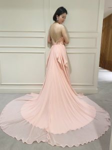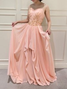 ベビーピンクの可愛らしいカラーに、特徴的なドレープの重なりで織りなすスカートのデザインは他に見たことのない1着となっております。
