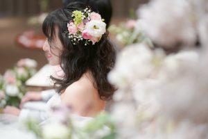 お花をサイドにつけ、背中が開いたドレスとの相性抜群です。