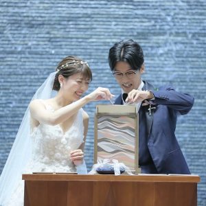 最後におふたりで砂を流し込んでゲストの皆様とつくるおふたりだけの