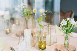 落ち着いたトーン、かつ小瓶にお花を散らしておしゃれな印象のゲストテーブルコーディネート