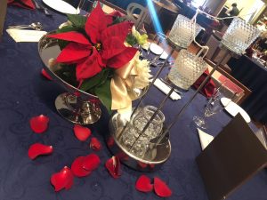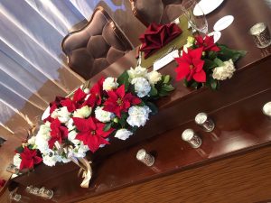 ロイヤルブルーのクロスに、レッドの大きなお花が